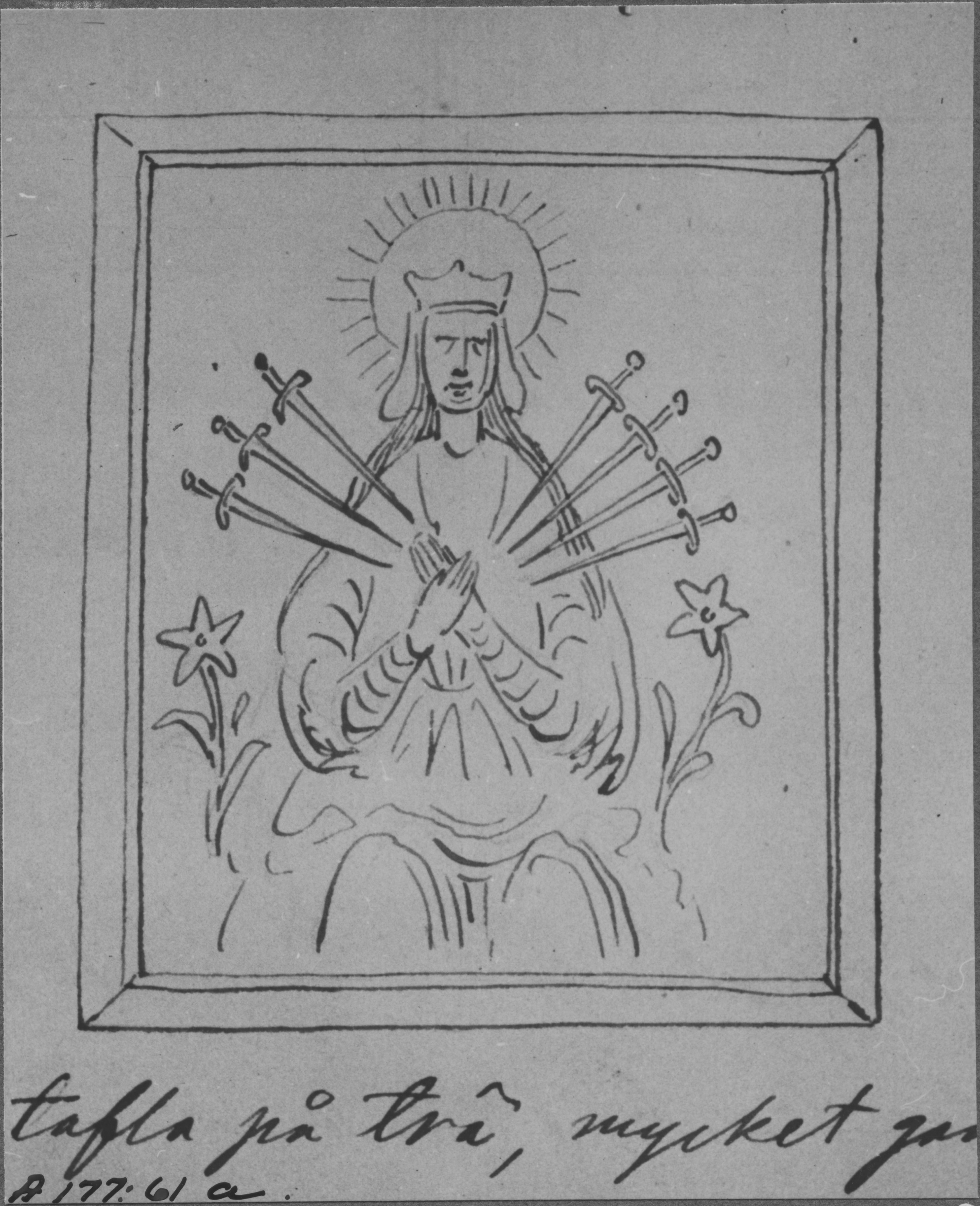 Beskrivning: Kristus med sex svärd mot kroppen. Teckning av tavla på trä ur P.A. Säve, 1862.