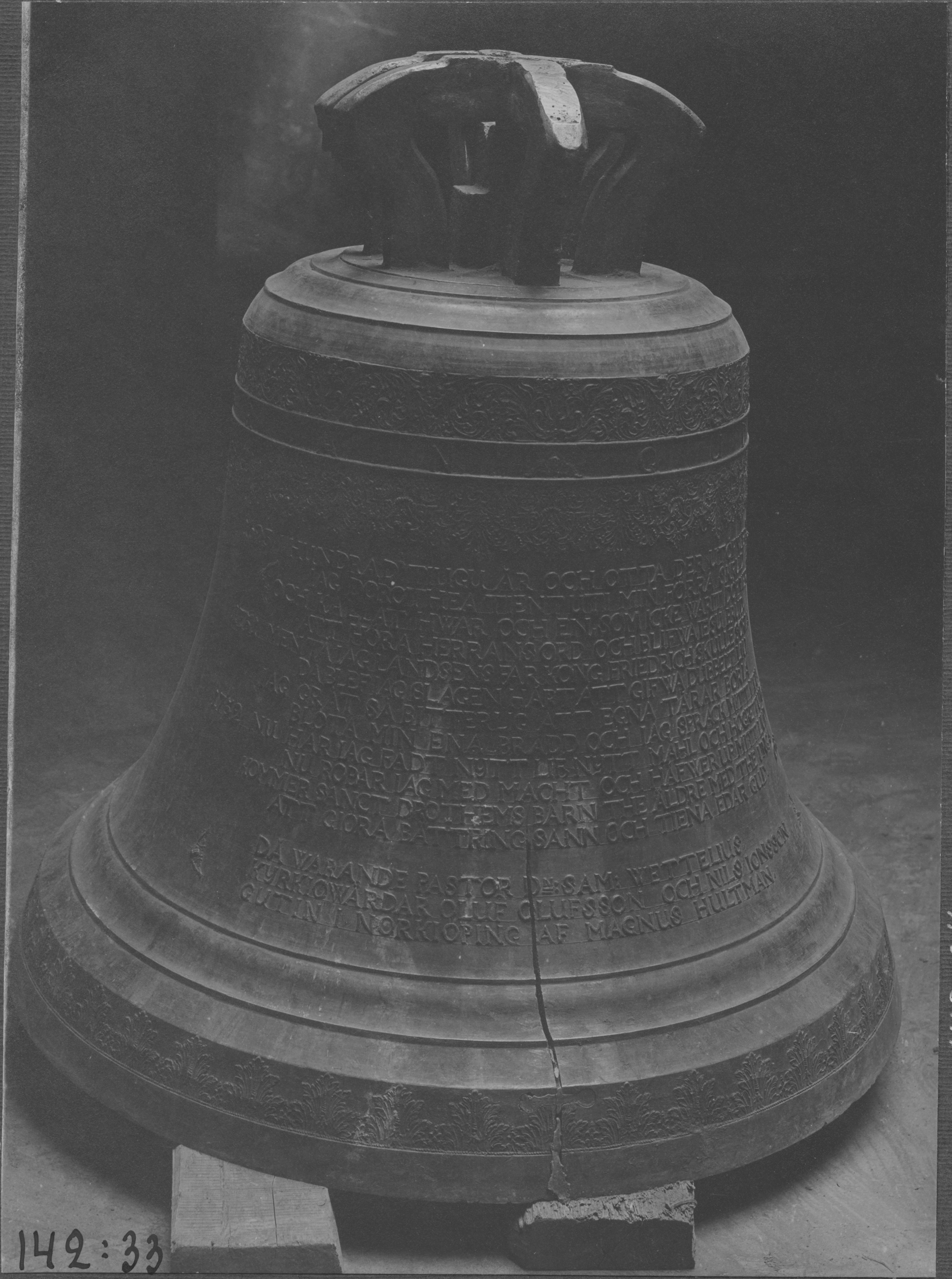 Beskrivning: Klocka (storklockan) med inskrift.