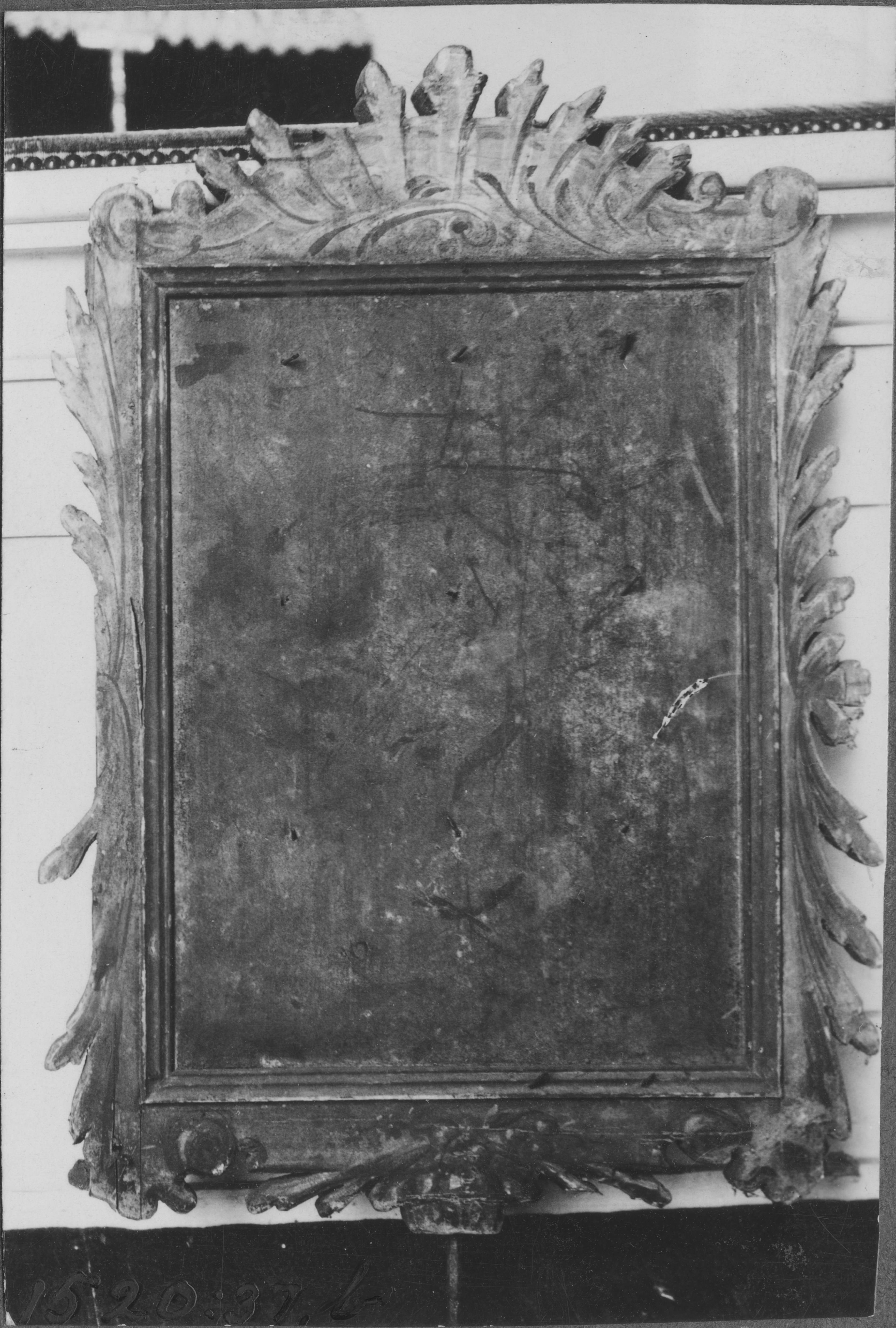 Beskrivning: Nummertavla av trä med utsågad ram och målade blommer. 1700-talet. Troligen från Högby gamla kyrka.