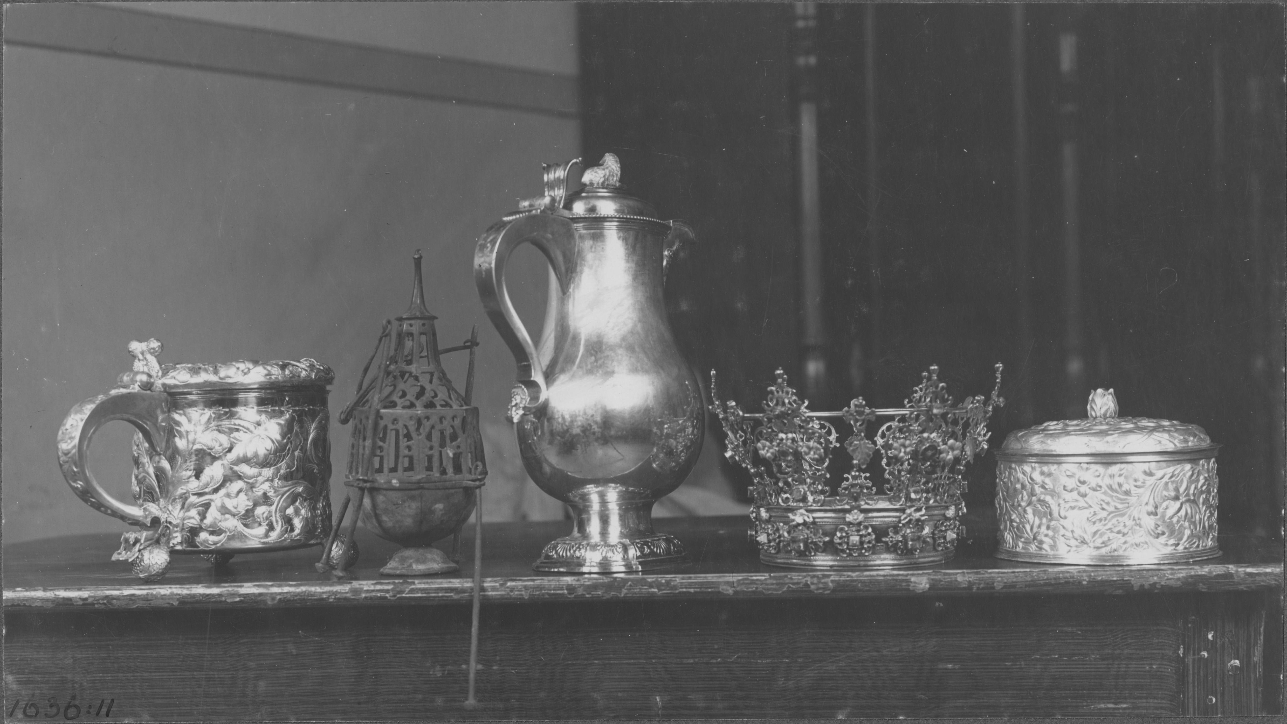 Beskrivning: Vinkanna av silver. Cylindrisk på tre driva kulfötter, drivna bladornament. Rökelsekar av malm. Lock med genombrutna ornament. 1200-talets början. Vinkanna av silver. Brudkrona av silver, förgylld. På pannringen infattade slipade stenar, rikt ornerad. Oblatask av silver med drivna och punsade blomornament. Omkring 1700. Snabbinventering.
