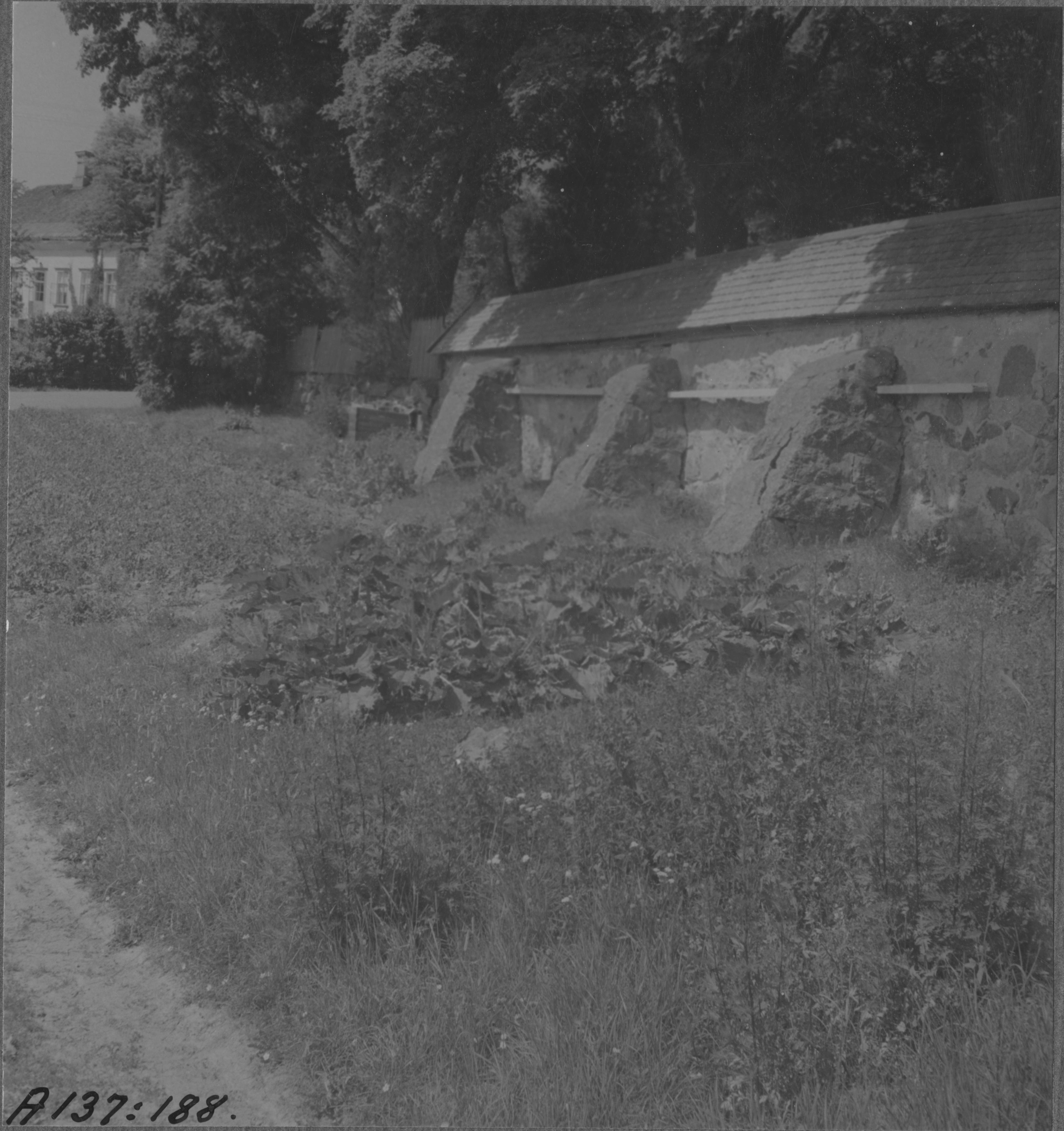 Beskrivning: Kyrkogårdsmuren med tjärade stickspån.