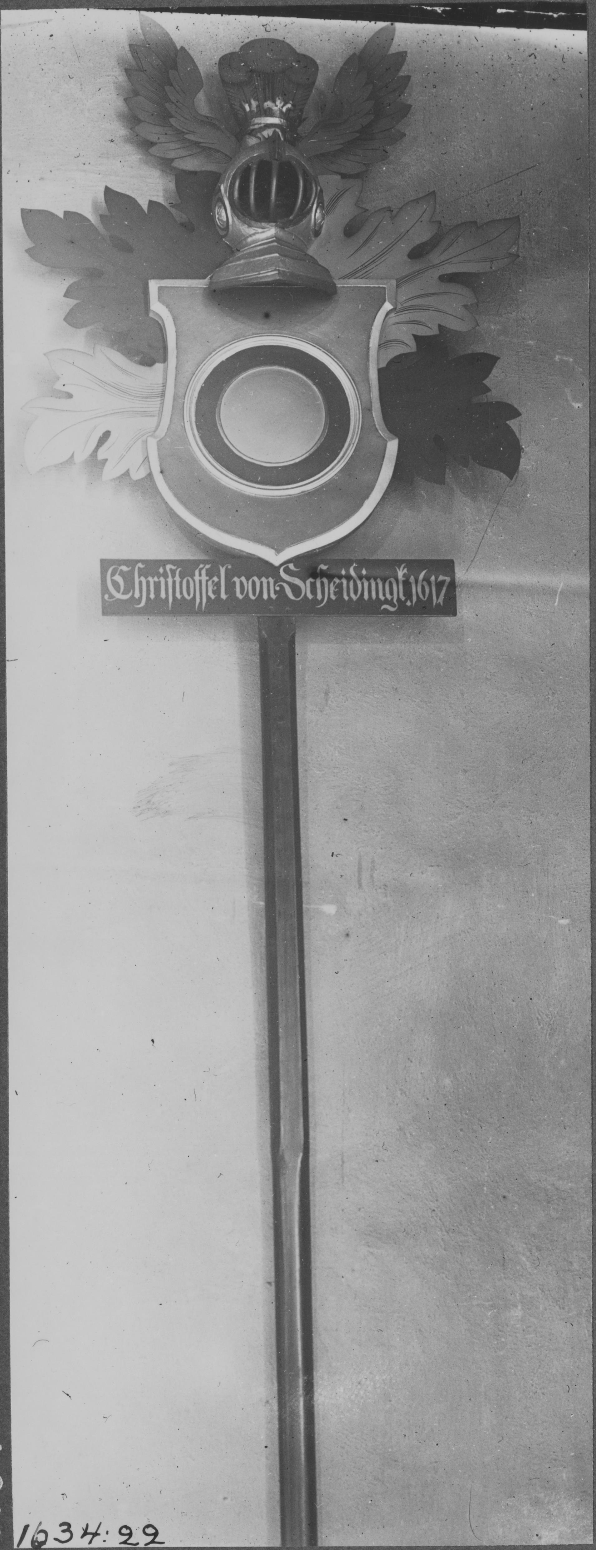 Beskrivning: Huvudbanér över Christoffer von Scheidingk, 1617.Av skulpterat trä och plåt. Snabbinventering.