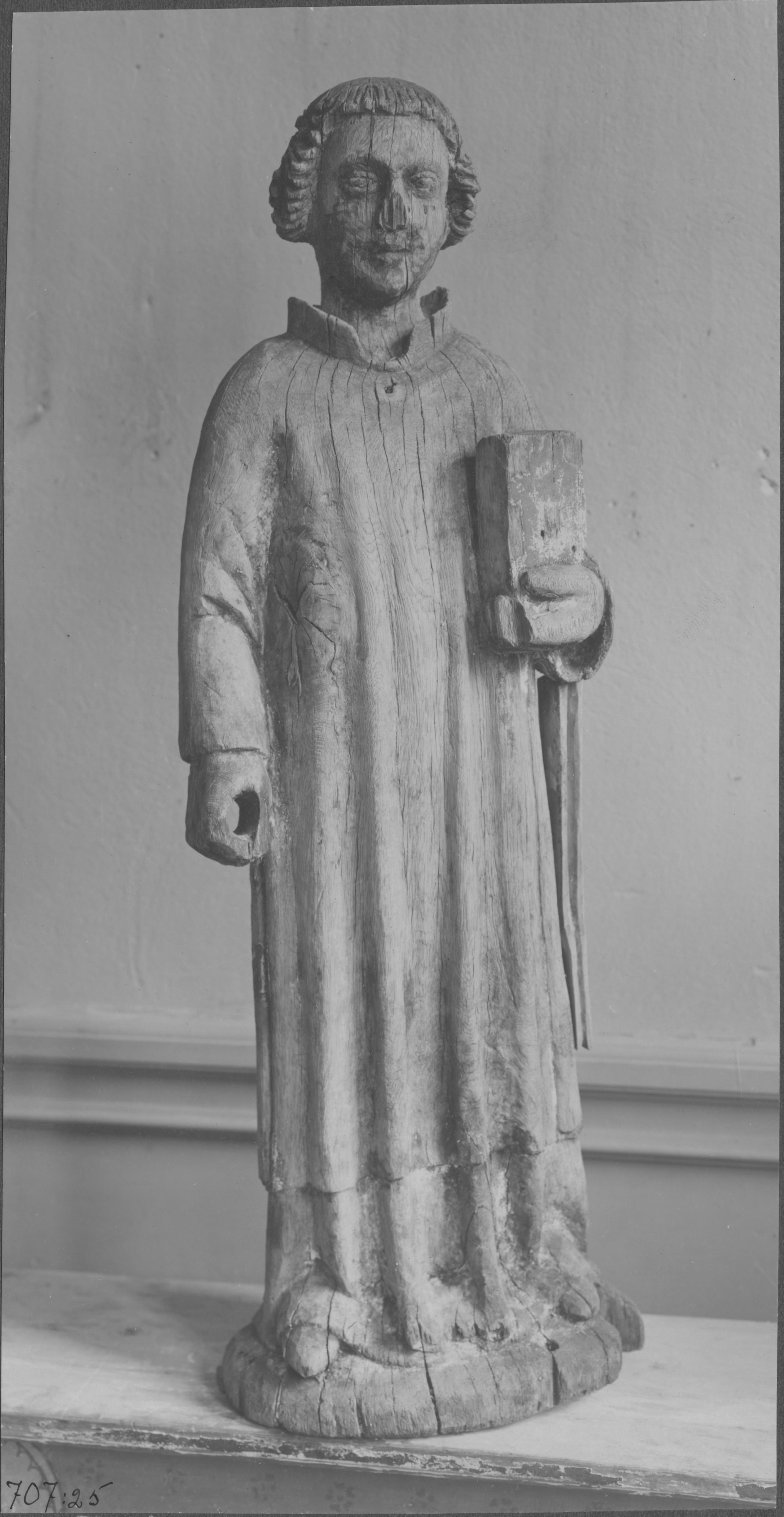 Beskrivning: Träskulptur av ek föreställande helgon med bok stående i vänster hand. Från omkring 1500. Före restaurering av Alfred Nilsson.