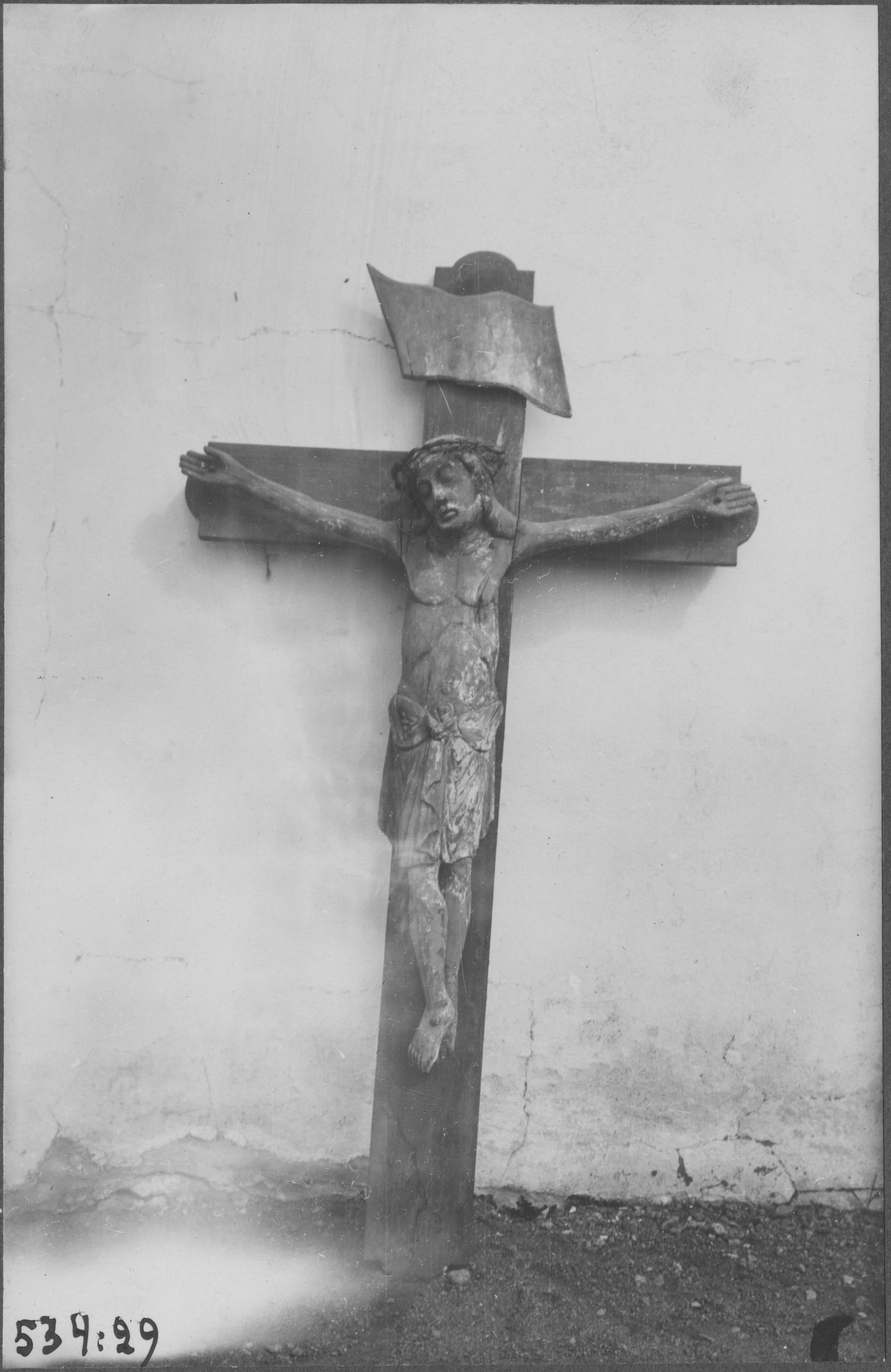 Beskrivning: Triumfkrucifix av trä. Figuren snidad i björk, korset av furu. Rester av färg på drapering och ansikte. Omkring 1200.