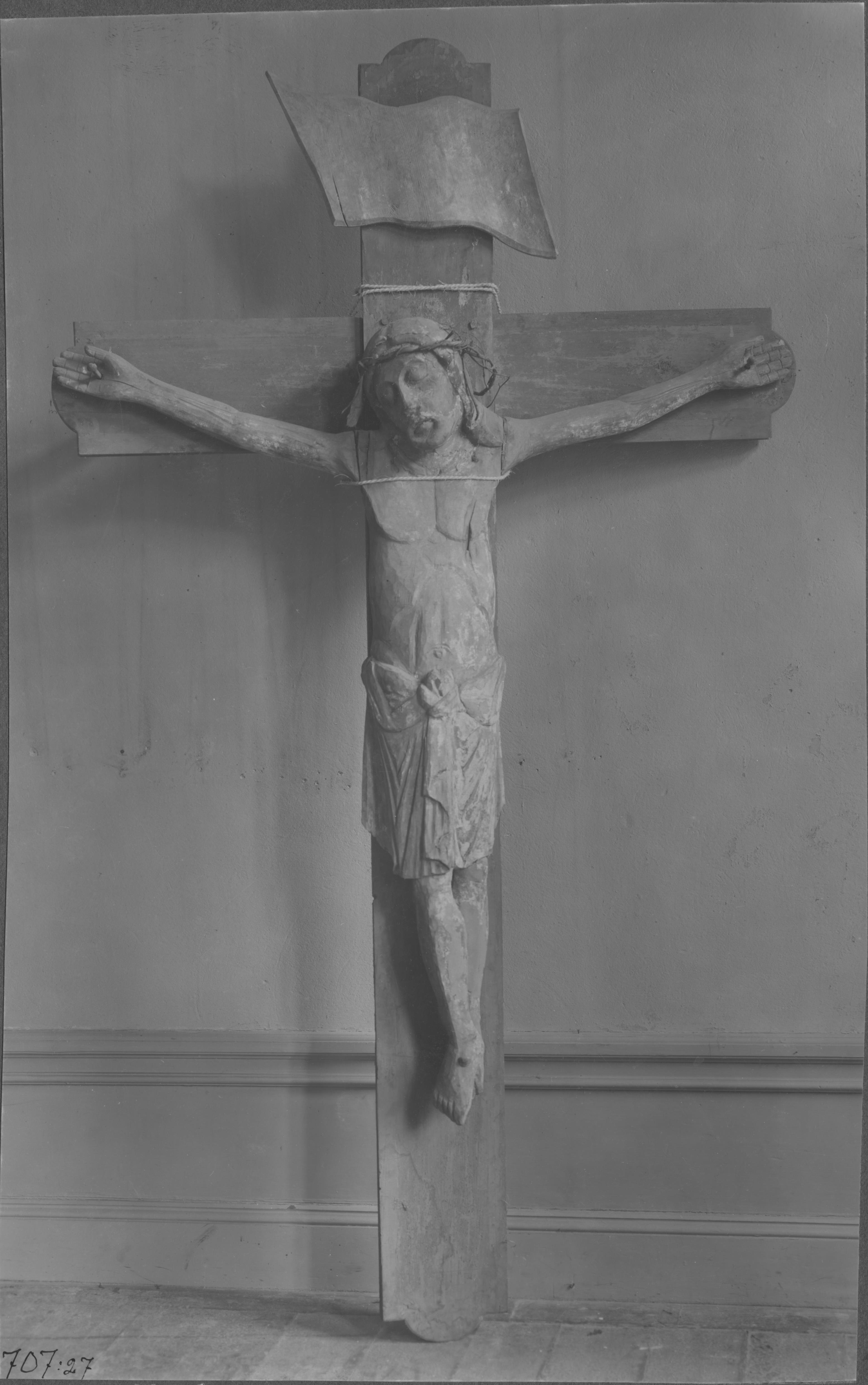 Beskrivning: Triumfkrucifix av trä. Figuren snidad i björk, korset av furu. Rester av färg på drapering och ansikte. Omkring 1200. Före restaureirng av Alfred Nilsson.