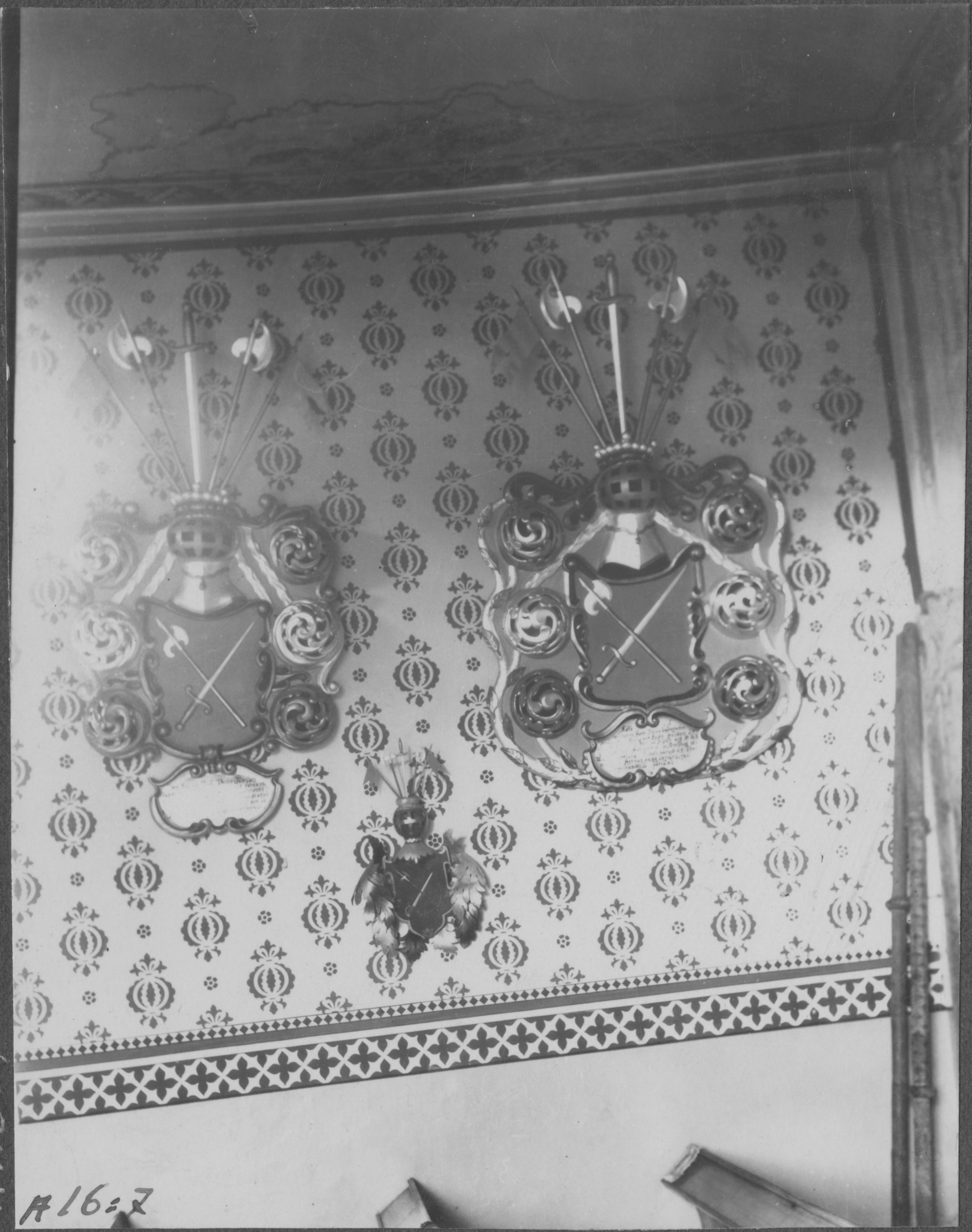 Beskrivning: Huvudbanér (?) av trä över Fahnehjelm. Målad sköld med bila och svärd. Hjälm av plåt.