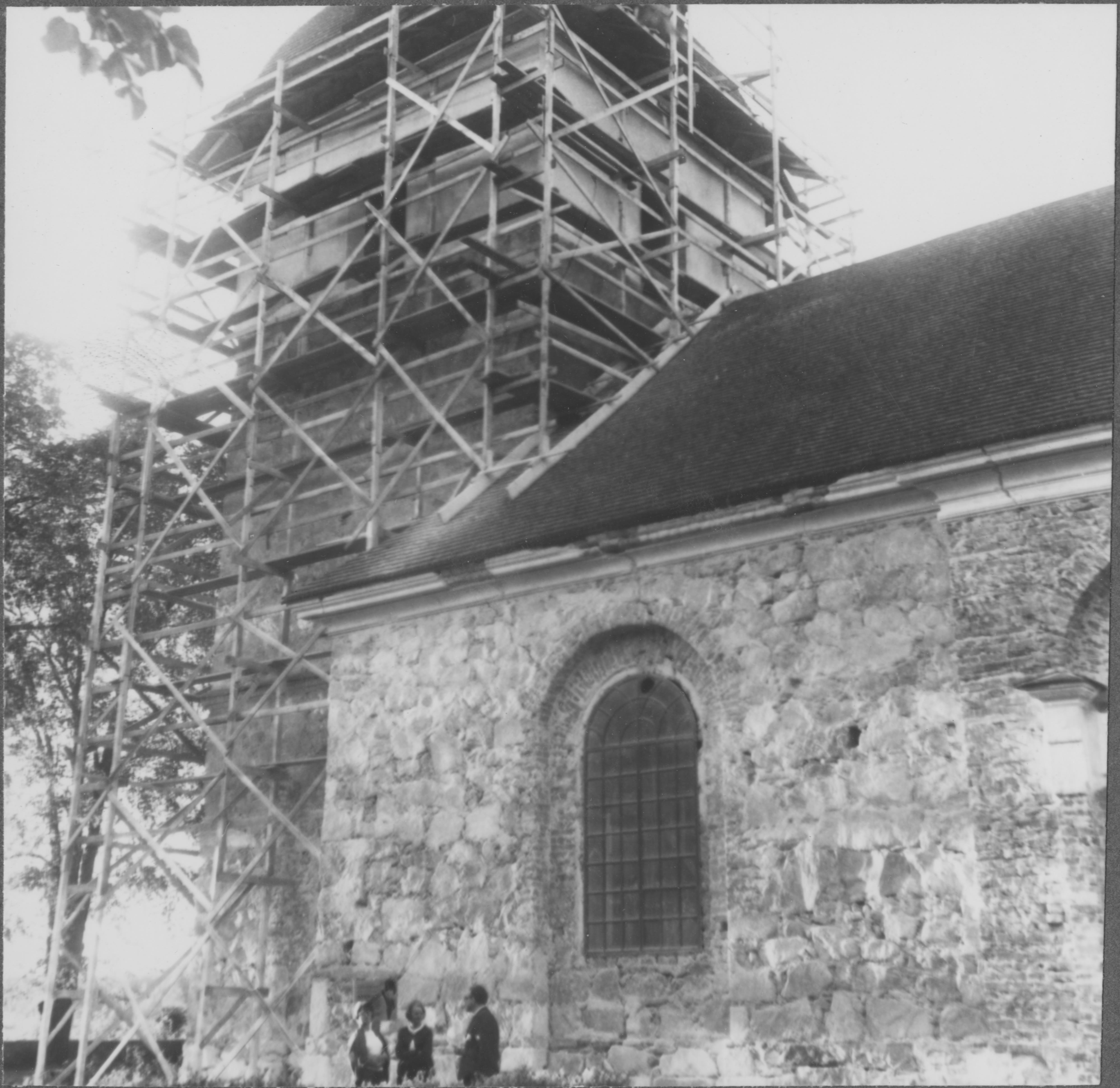 Beskrivning: Kyrkans västra del. Från sydost. Murverksdokumentation i samband med att putsen knackades ner. Profilerade stenar uttogs ur murverket för att förvaras lösa i kyrkan.