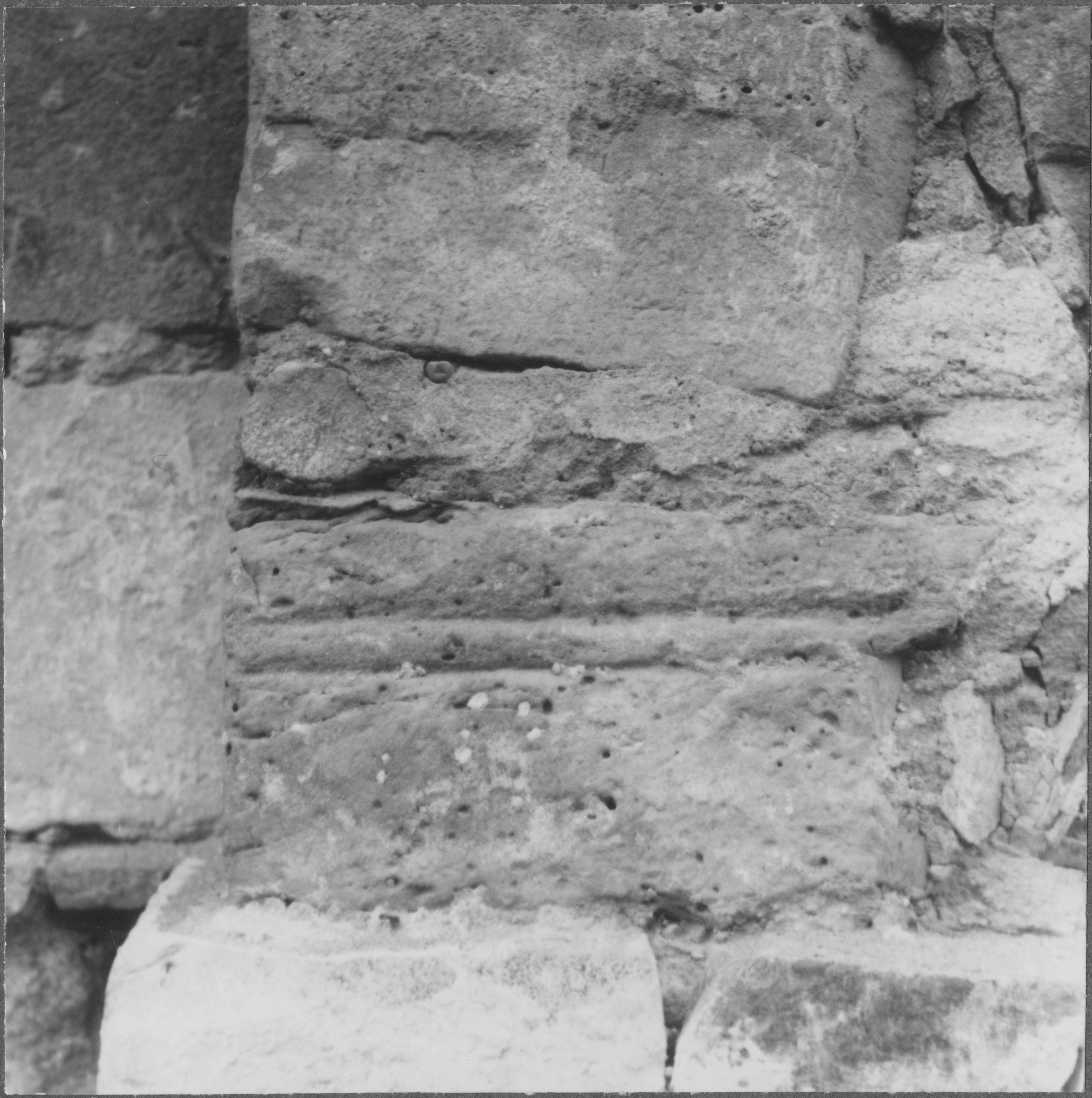Beskrivning: Sten nu-mmer 4. 50X27X35 cm. Murverksdokumentation i samband med att putsen knackades ner. Profilerade