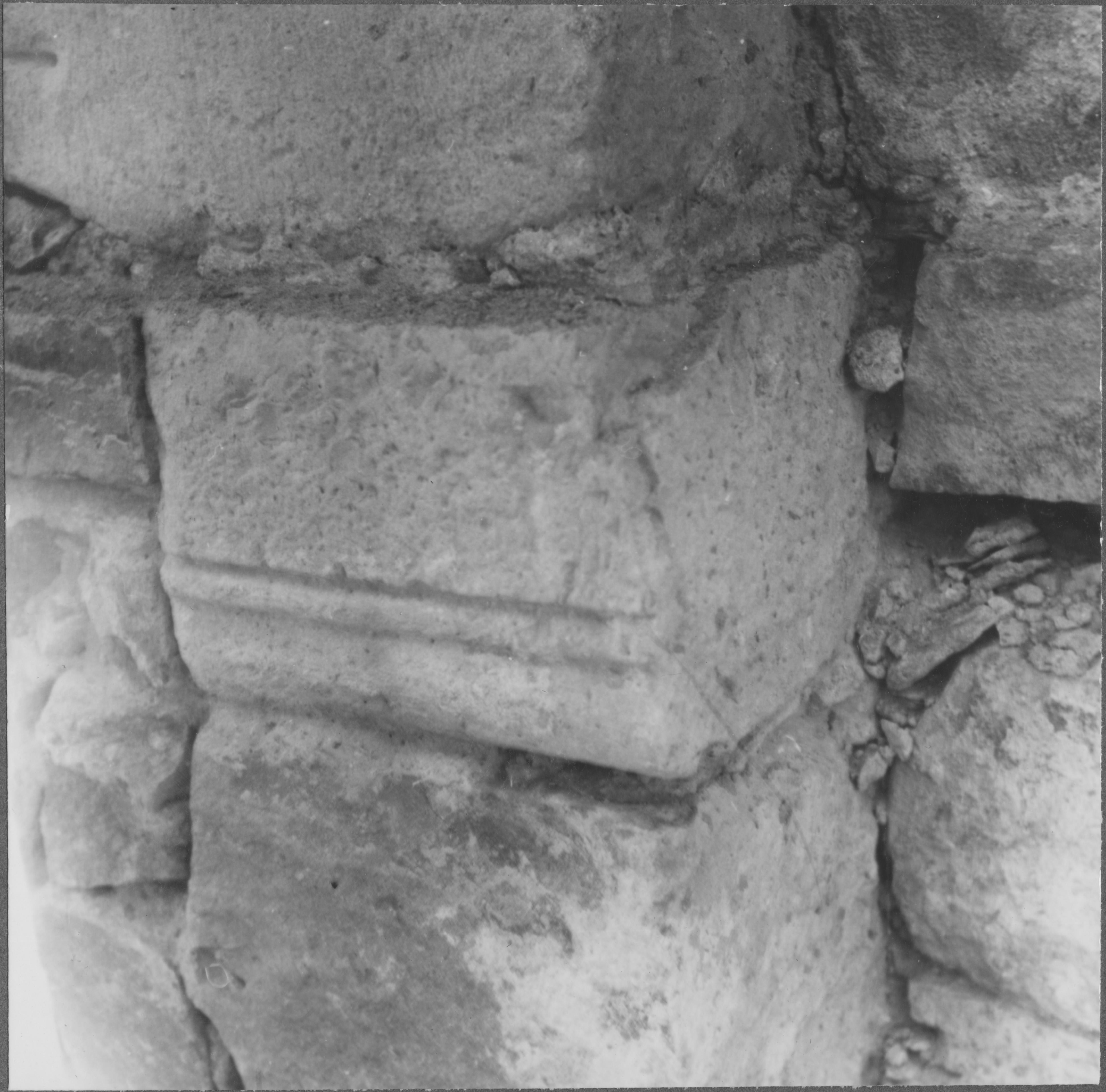 Beskrivning: Sten nummer 5. 40X40X? cm. Murverksdokumentation i samband med att putsen knackades ner. Profilerade