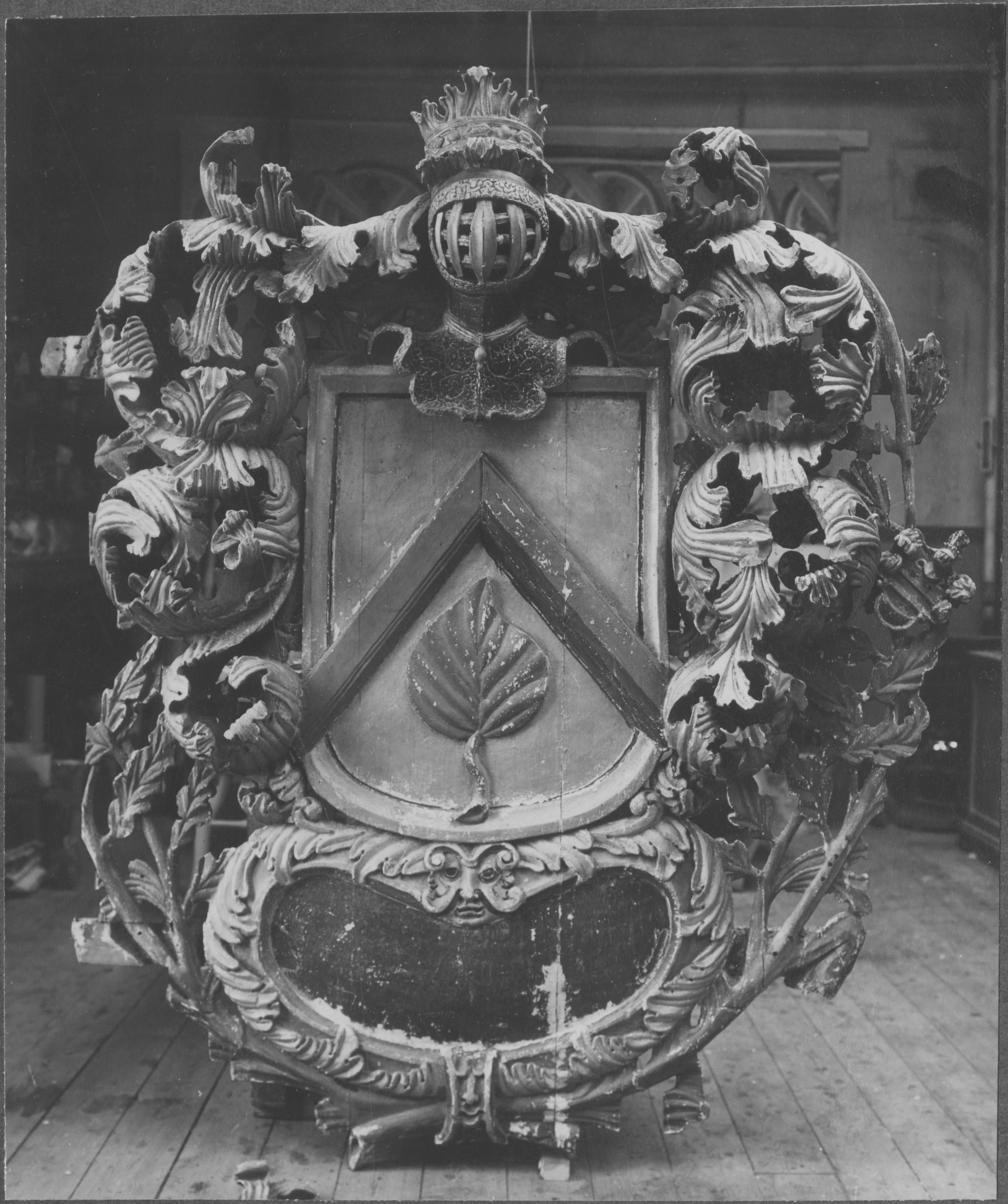 Beskrivning: Begravningsvapen över Eric Bengtson Bagge, 1631-1692. Snidat, målat och kredrat trä. Sköld med Baggevapnet i guld. Före konservering.