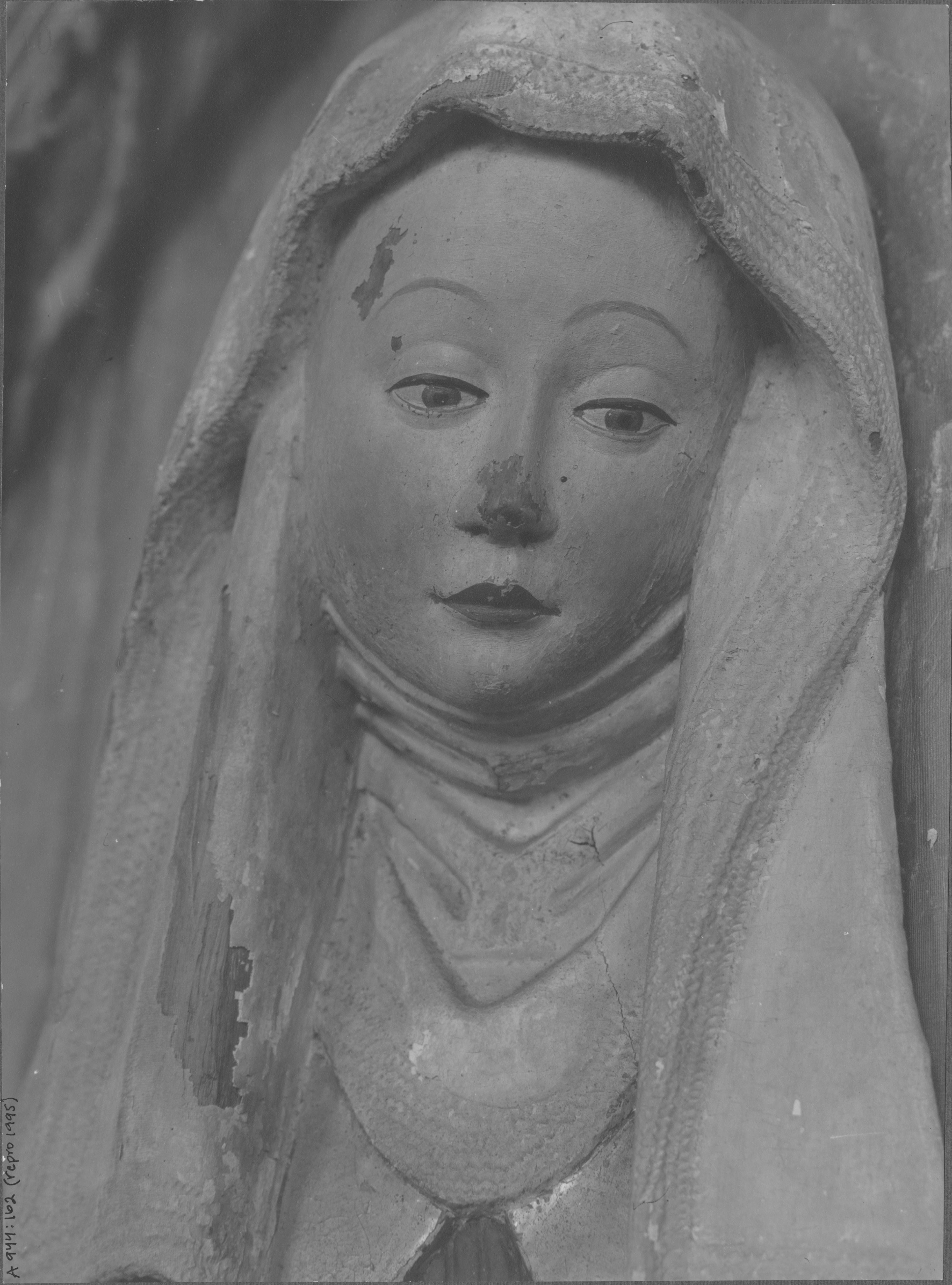 Beskrivning: Altarskåp i ek. Flera scener fragmentariska och många helgon i corpus övre del förlorade. Detalj av corpus. Senmedeltid.