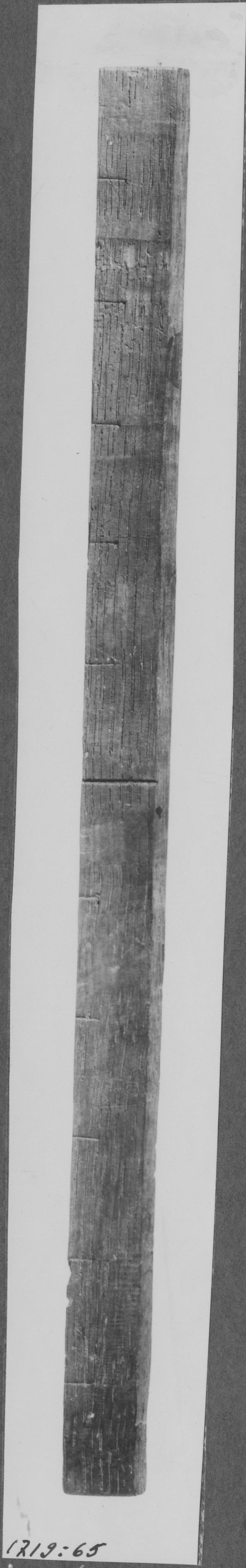 Beskrivning: Alnmått av ek med inristade kvartsaln- och fotmärken. Medeltid.