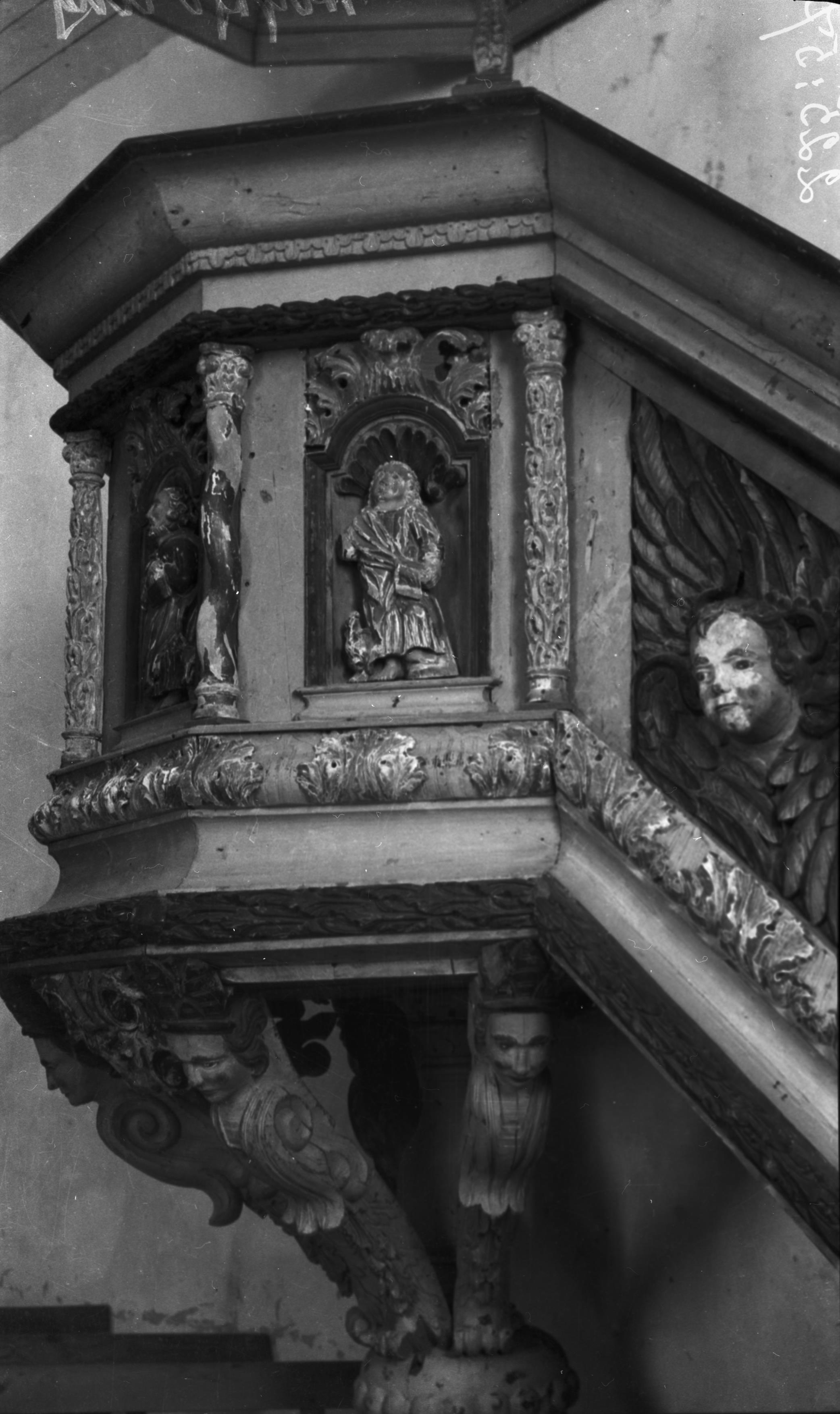 Beskrivning: Predikstol, detalj av korgen.