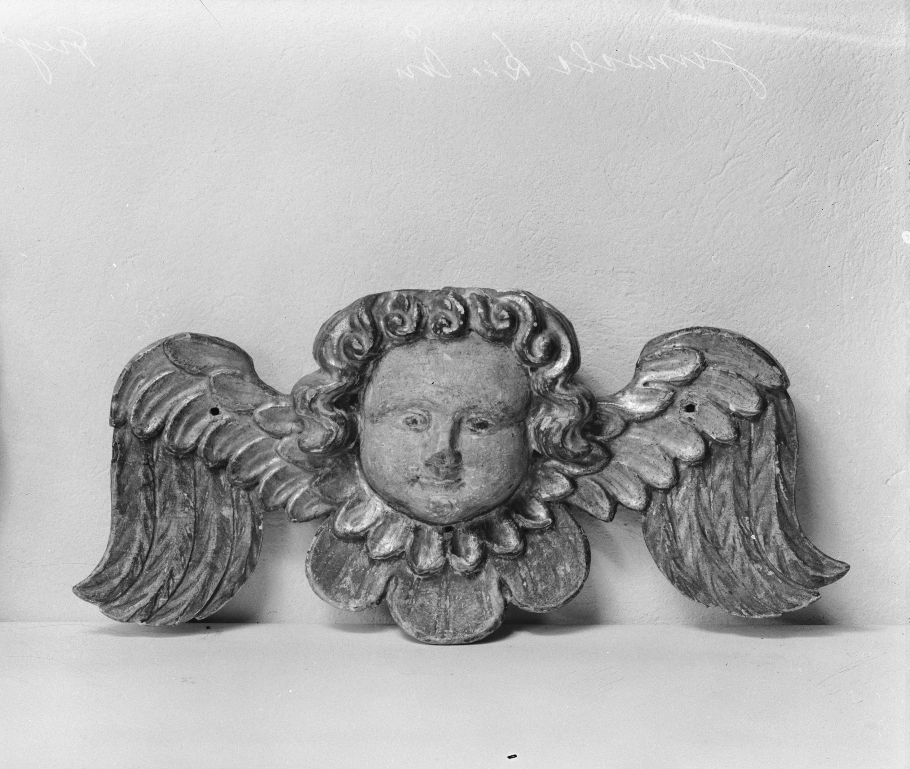 Beskrivning: Kerubhuvud, förgyllt furu.