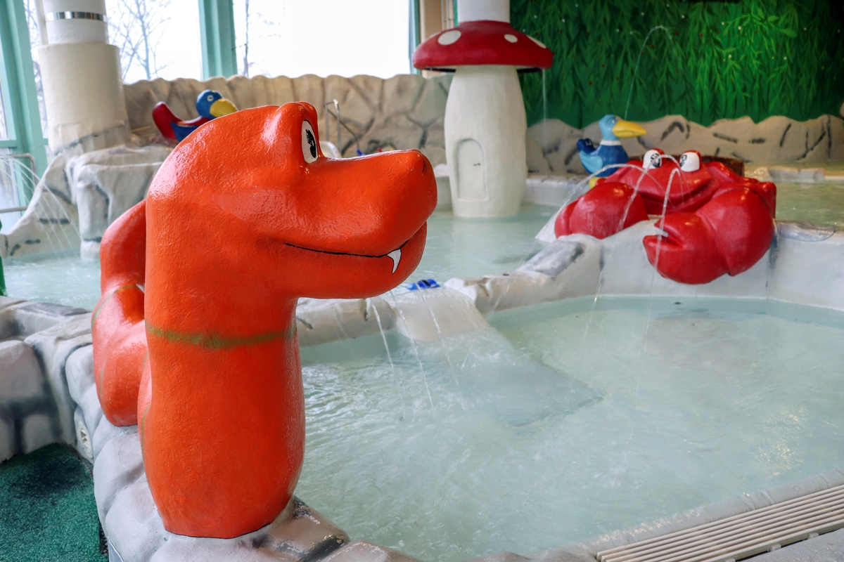 Titel: Plaskpool för små barn med färgstarka djur som sprutar vatten.