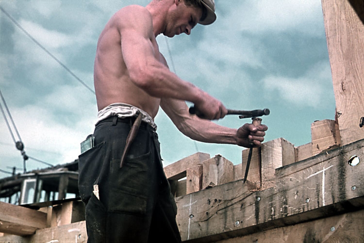En man slår ut spår i relingen för däcksbalken. Bergs varv, Öckerö