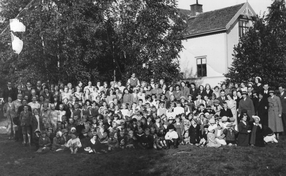 Wesleykyrkans och Hagakapellets söndagsskolor vid en sommarfest på Sjöbo år 1934.