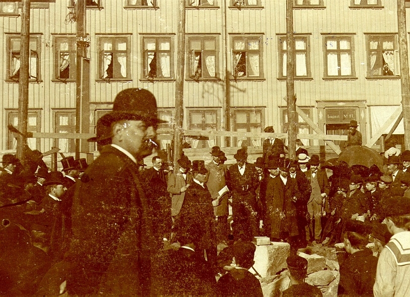 Grundstensinvigning av Wesleykyrkan i på Lugnet i Borås den 24 aug. år 1902. I mitten av bilden syns August Berg. Byggmästare var C.A. Hallén (Göteborg) och arkitekt H. Hedlund (Göteborg).