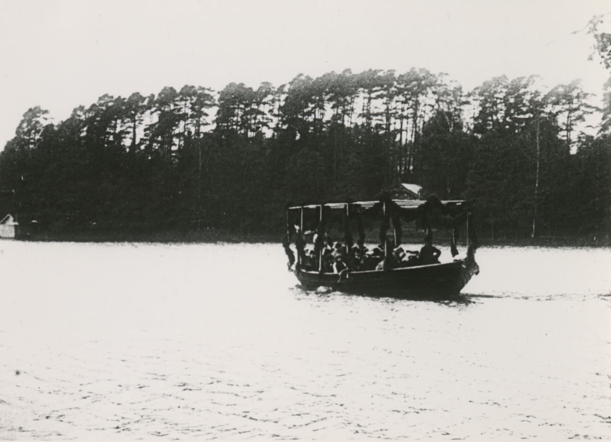 Hantverksmässan 1911. Blomstersmyckad båt som fraktade publik över Ramnasjön från Göteborgsvägen till Ramnaparken.
