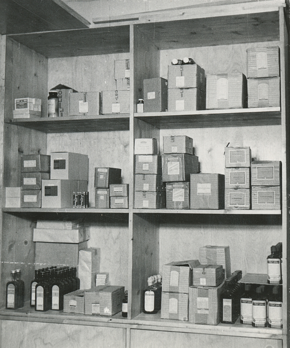 Apoteket Kronan, interiör. Hyllor med medicin.