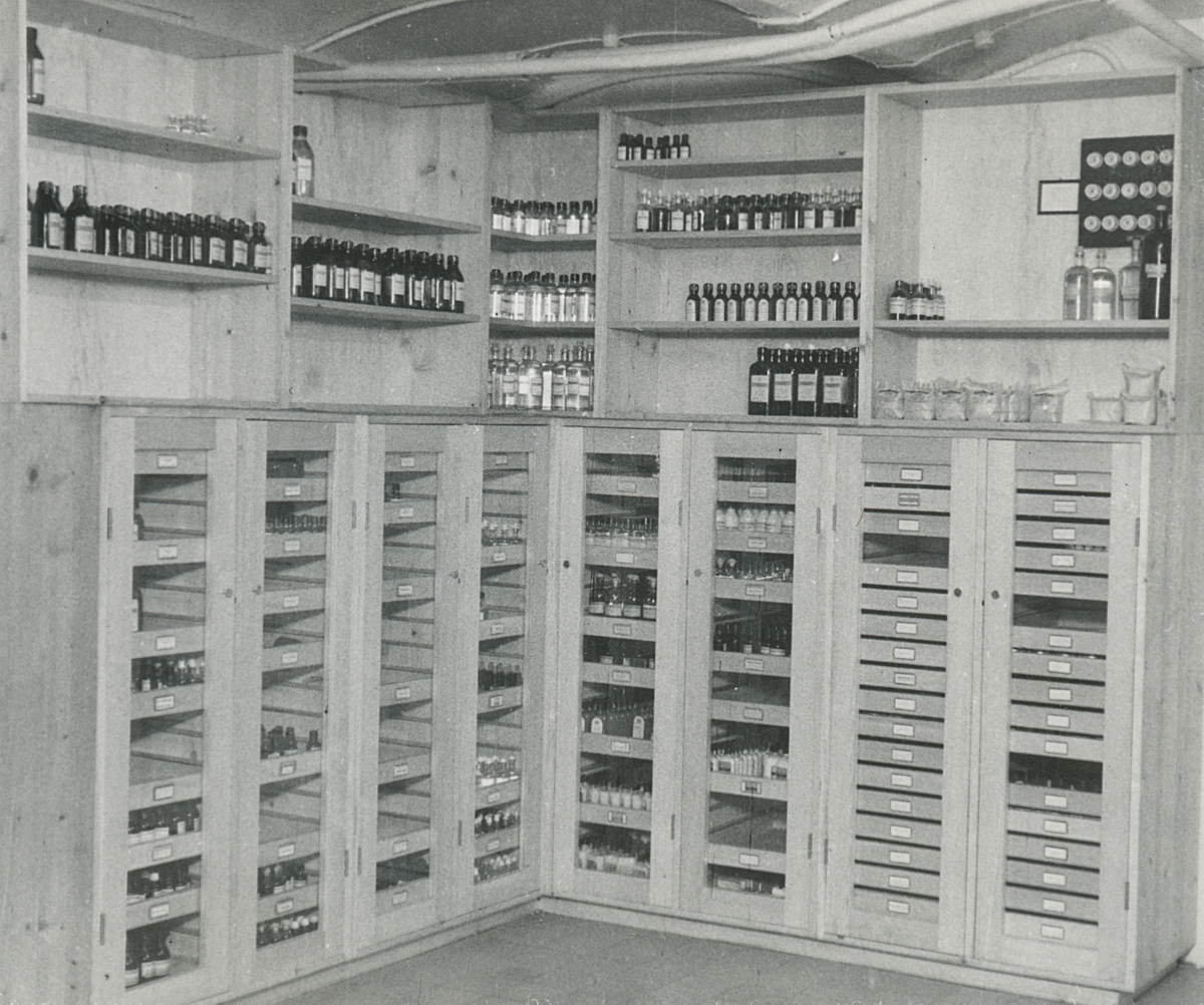 Apoteket Kronan, interiör. Hyllor med medicin.