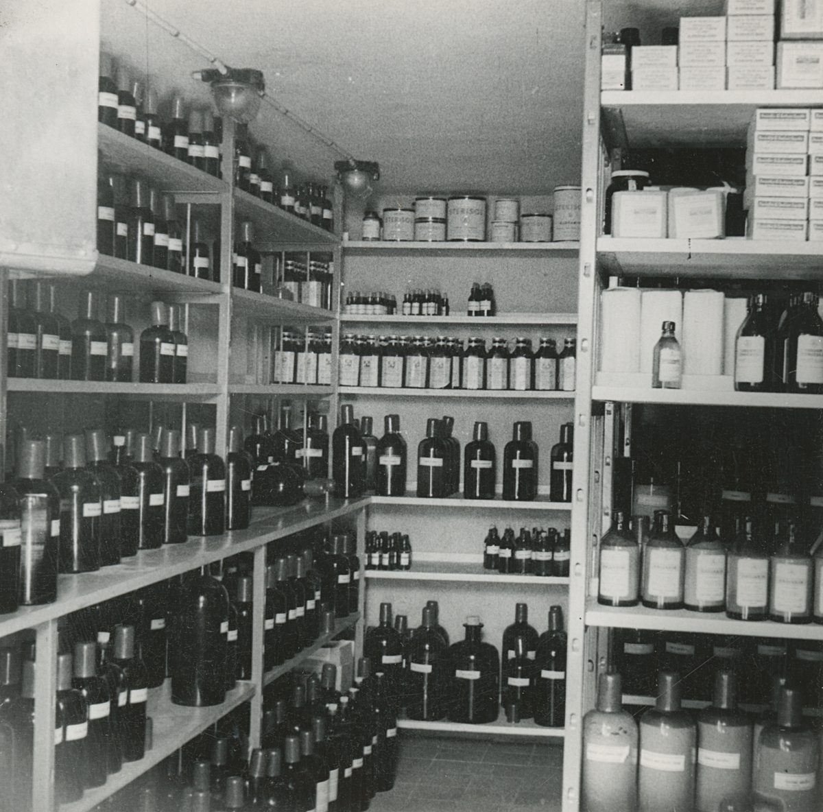 Apoteket Kronan, interiör. Hyllor med medicin.