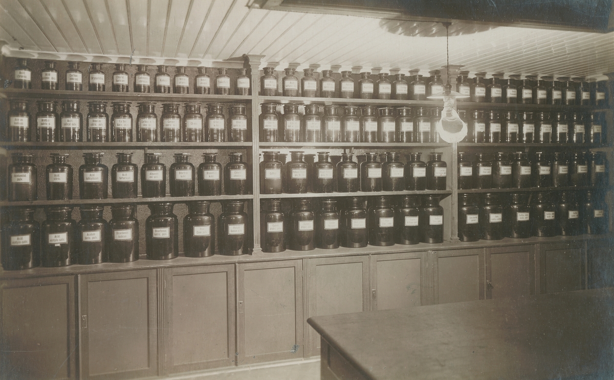 Apoteket Kronan i Borås 1925. Förvaring av ingredienser.