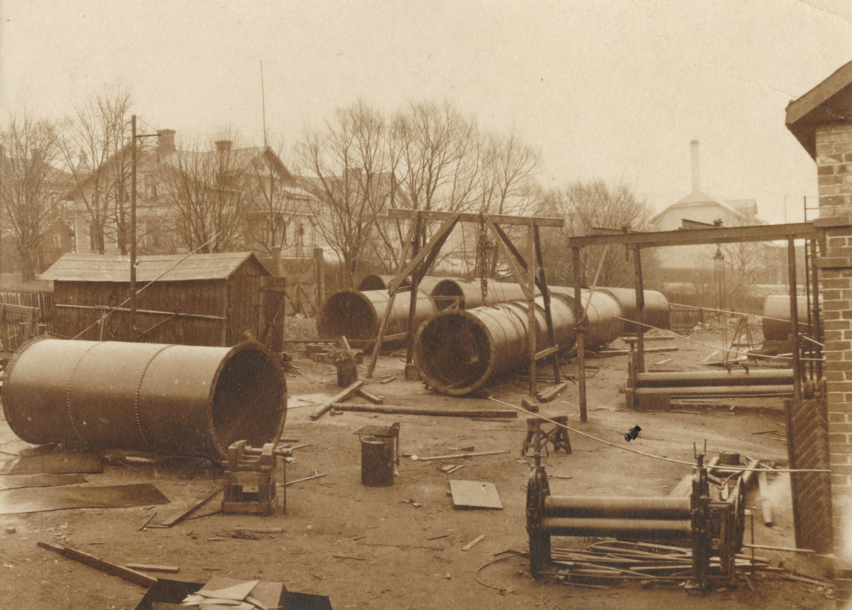 Plåtslageriarbetet utfördes före år 1913 till större delen under bar himmel. Direktörsvillan i bakgrunden.