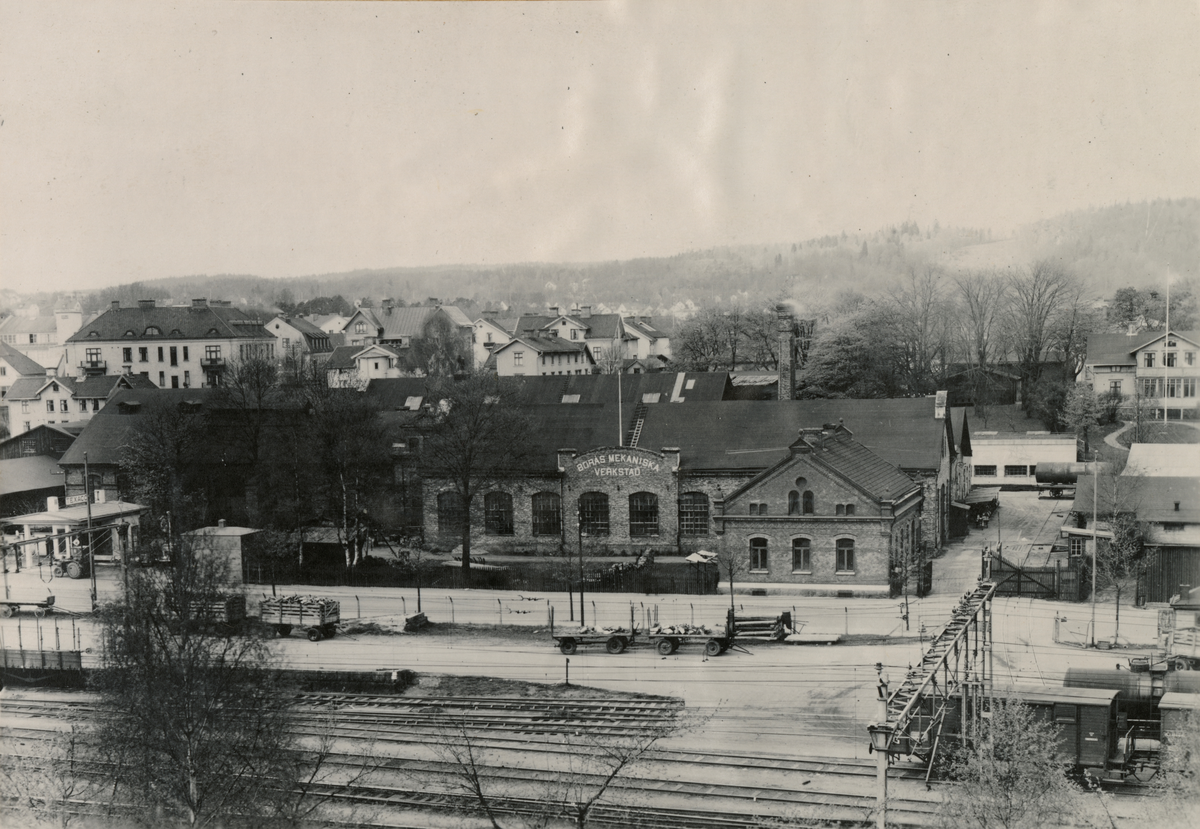 Borås Mekaniska Verkstad, år 1948. Bild tagen i nordvästlig riktning. I bakgrunden syns hus i området Norrby Gärde.