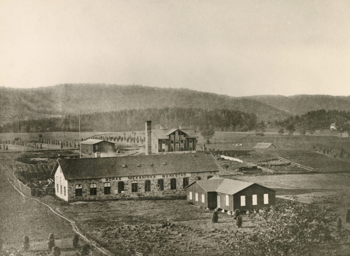 "Den 29 maj år 1877 bifälla stadsfullmäktige i Borås en ansökan från handlan - den Aug. Strömqvist och ing. Claes Brinell att få anläggande av gjuteri och mekanisk verkstad 'uppföra i rak linje med fabrikör Andersons nya spinneri en gråstensbyggnad, 135 fot lång och 40 fot bred.' Denna ursprungliga verkstadsbyggnad finnes allt fortfarande kvar och ingår i den nuvarande verkstadskomplexet. Hösten år 1879 såldes verkstadsrörelsen till ingenjör Herman Gustavson vilken upptog tillverkning av vävstolar samt diverse handelsgjutgods. Bilden visar verkstaden år 1882."
