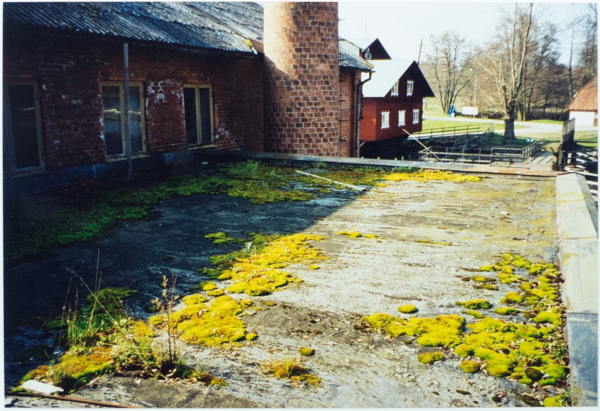 Titel: Dokumentation av Maskinverkstads exteriör. Mossbeväxt tak.