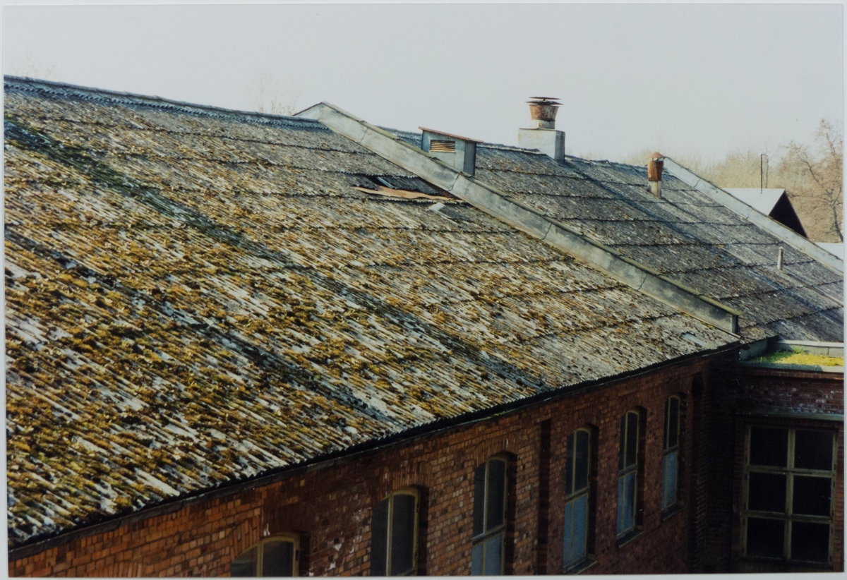 Dokumentation av Maskinverkstads exteriör. Mossbeväxt och skadat tak.