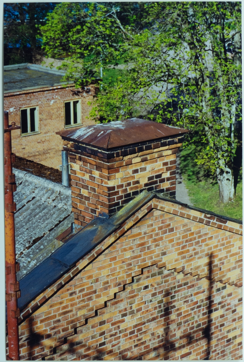 Mekaniska verkstadens östra gavel med skorsten, del av matsalen, sett från taket på Gjuteriet