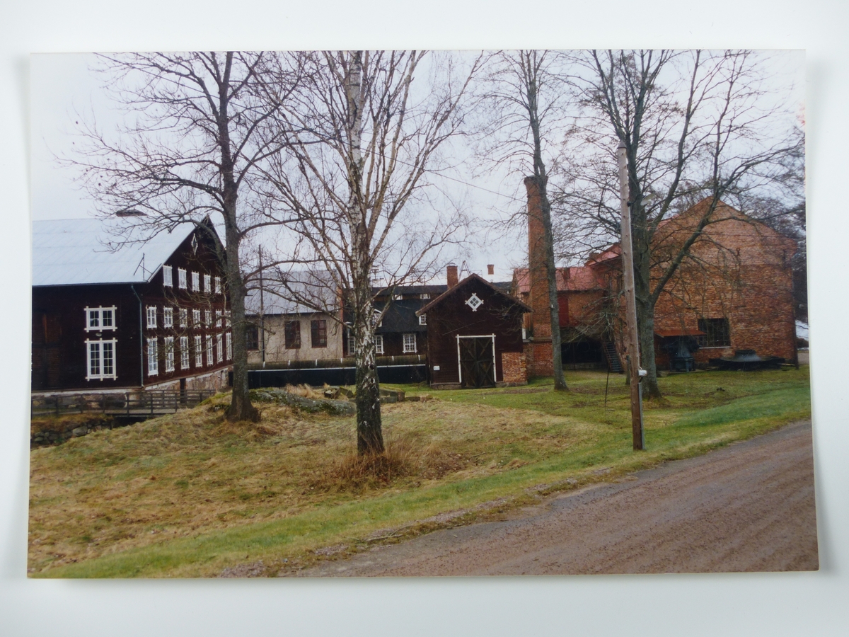 Titel: Fotografiet visar en del av Forsvik bruk såsom Träsliperiet, Metallgjuteriet, Smedjan och Kalorifären. Fotografiet är taget på platsen som ibland kallas för Forsviks torg utanför Mjölnarbostaden.