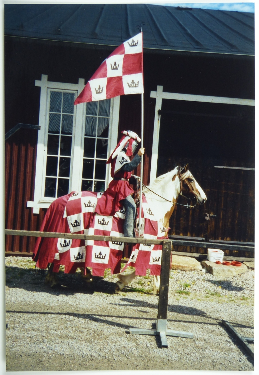 Västgöta lekar på Forsviks bruk. Medeltida tävlingar 25 augusti 2001. Hästburen riddare i röd-vit