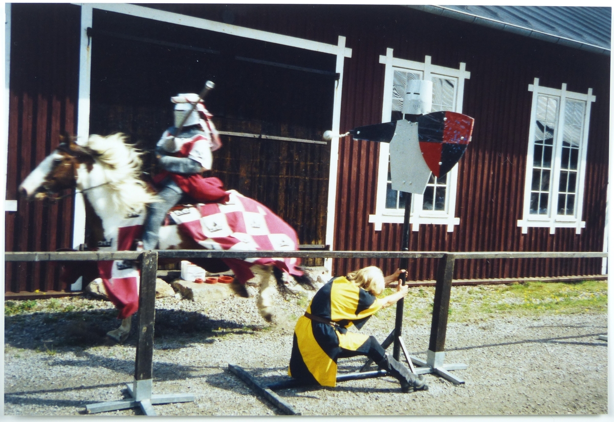 Västgöta lekar på Forsviks bruk. Medeltida tävlingar 25 augusti 2001. Hästburen riddare i röd-vit