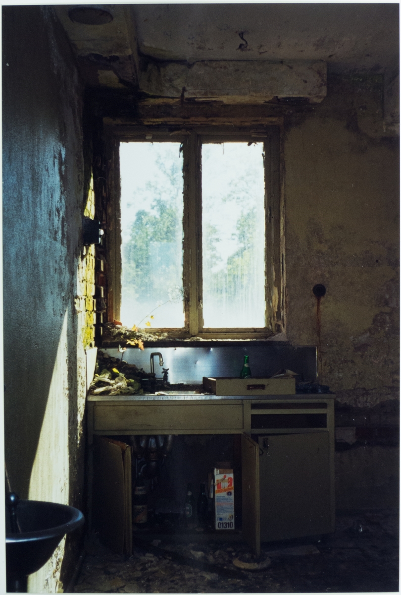 Maskinverkstaden: dokumentation inför utvändig restaurering. Skador efter takläckage från takbrunn vid pentryinredning i matsalen. Fönstersnickerierna ruttna.