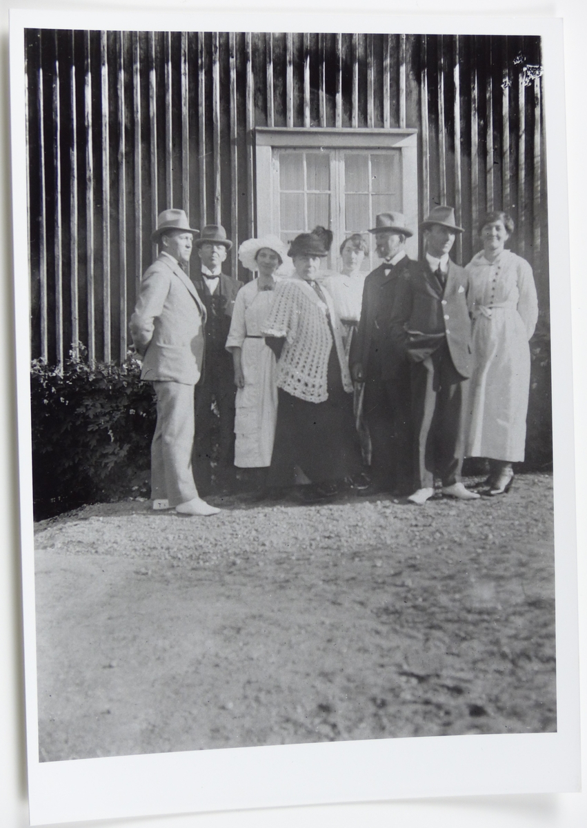 Svart-vit fotografi på familjen Svahn framför Mjölnarbostaden. Från vänster Bertil, Hjalmar, Mimmi, Gustava, Thea, Viktor, Martin och Gerda
