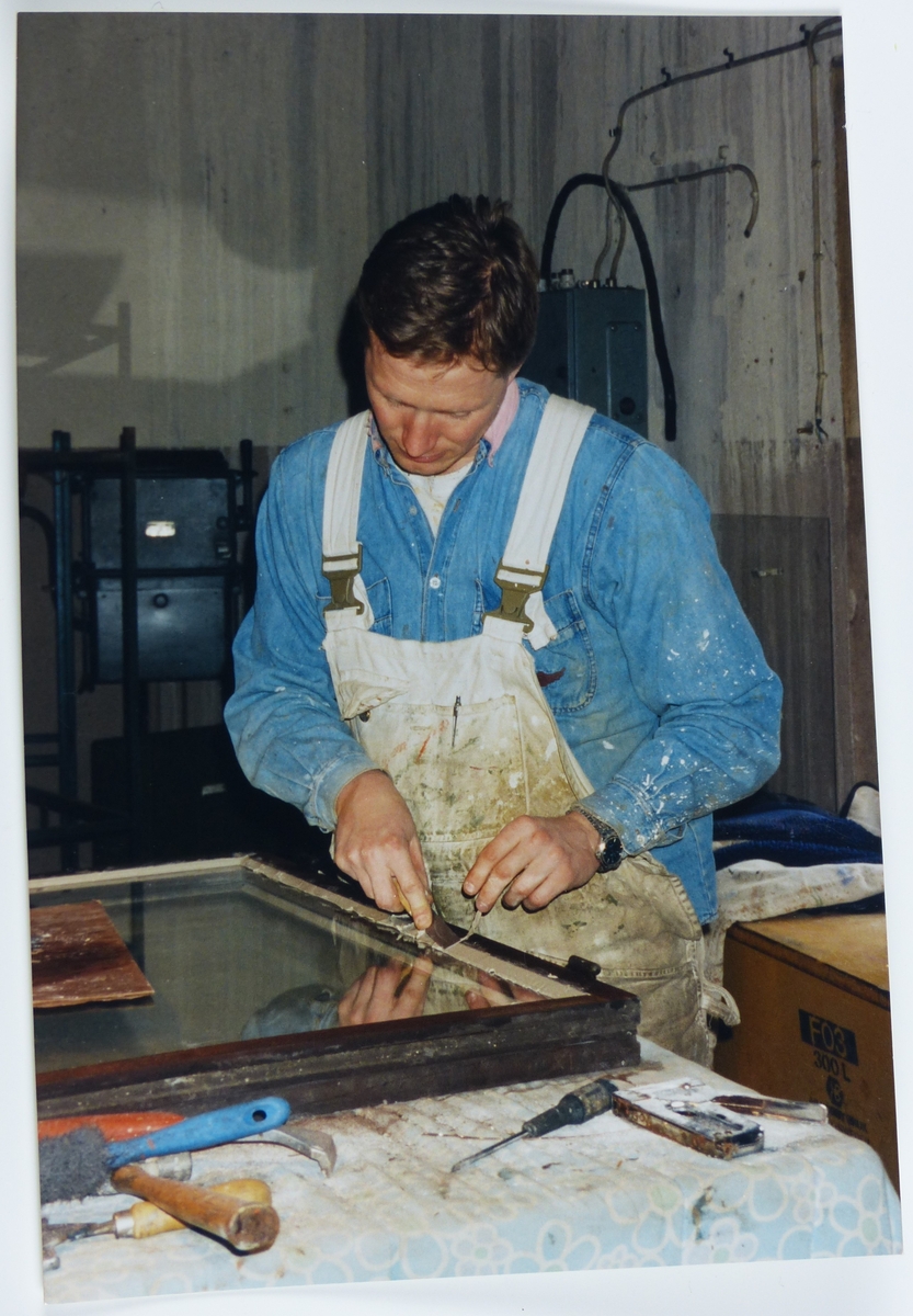 Målaren Krister Johansson kittar Mekaniska verkstans fönster.