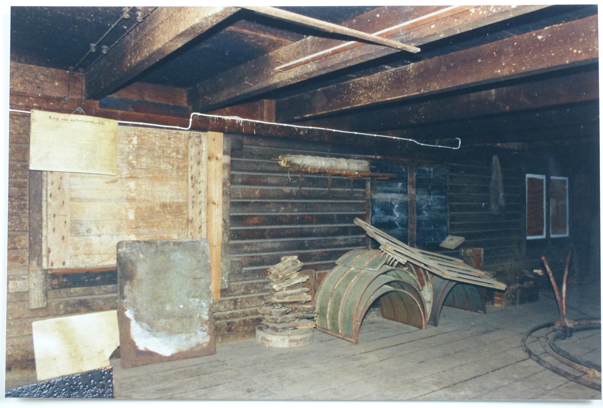 Träsliperiet, före renovering. Slipstolslokal, mot vägg till bildspelslokal.