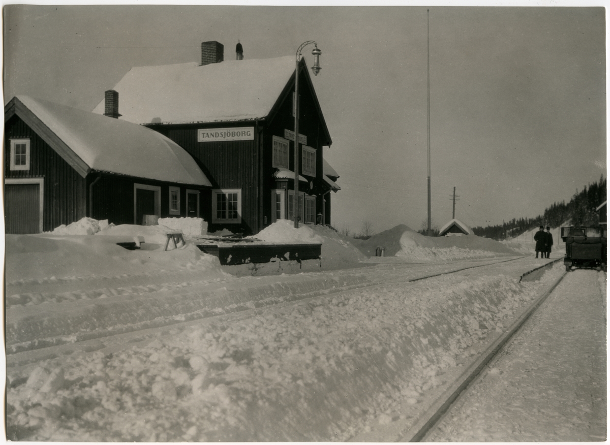 Orsa - Härjedalens Järnväg, OHJ. Tandsjöborg på linjen Orsa - Sveg taget i februari. Det står två mjölkkannor vid stationen.