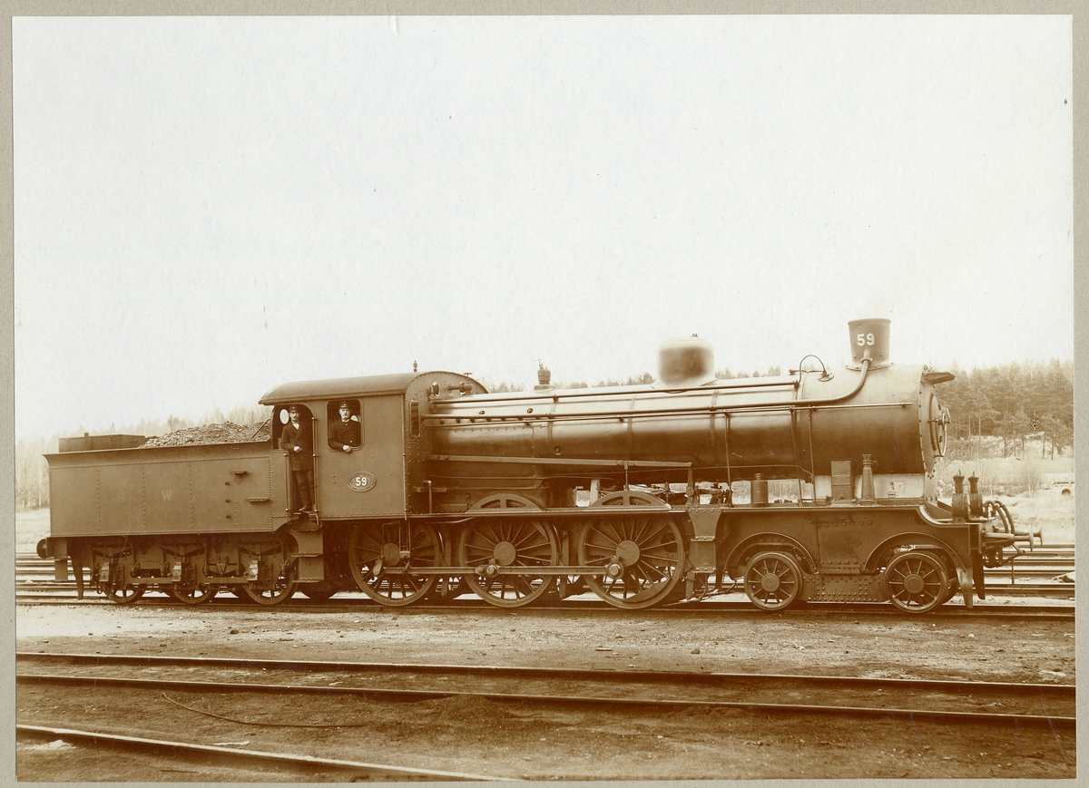 SWB H3 59 Fotografiet taget i början av november 1914 i Köping. Lokförare Vilhelm Theodor Lännvall född 21/8 1860, Lokeldare Ernst H. V. Larsson född 2/3 1887.