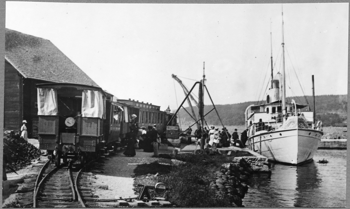 Persontåg med sommarvagnar vid Hästholmens hamn.
