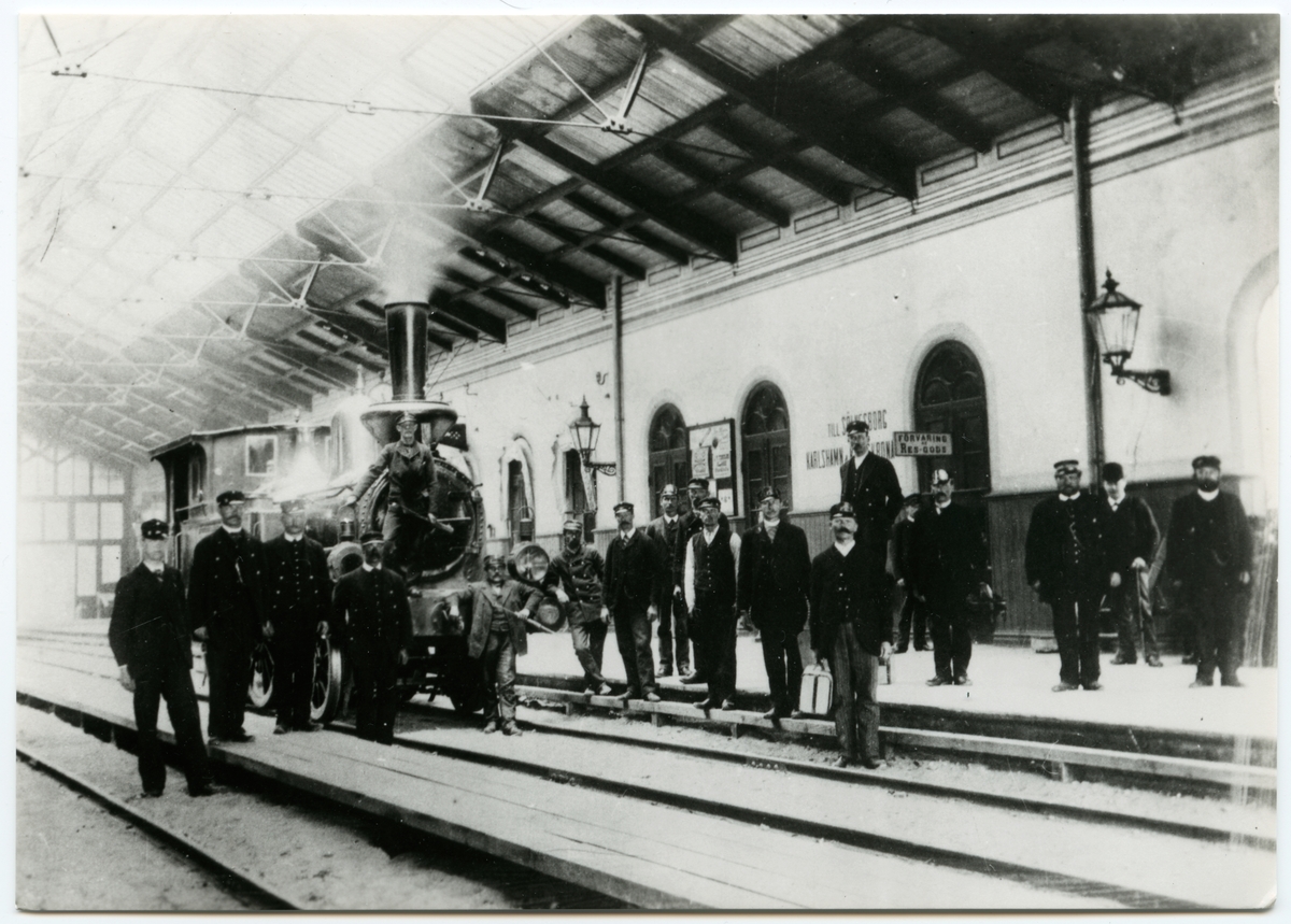 Personal uppställda i banhallen på Kristianstads Järnvägsstation. Loket är Kristianstad - Hässleholms Järnvägar, CHJ lok 3 "Christianstad".