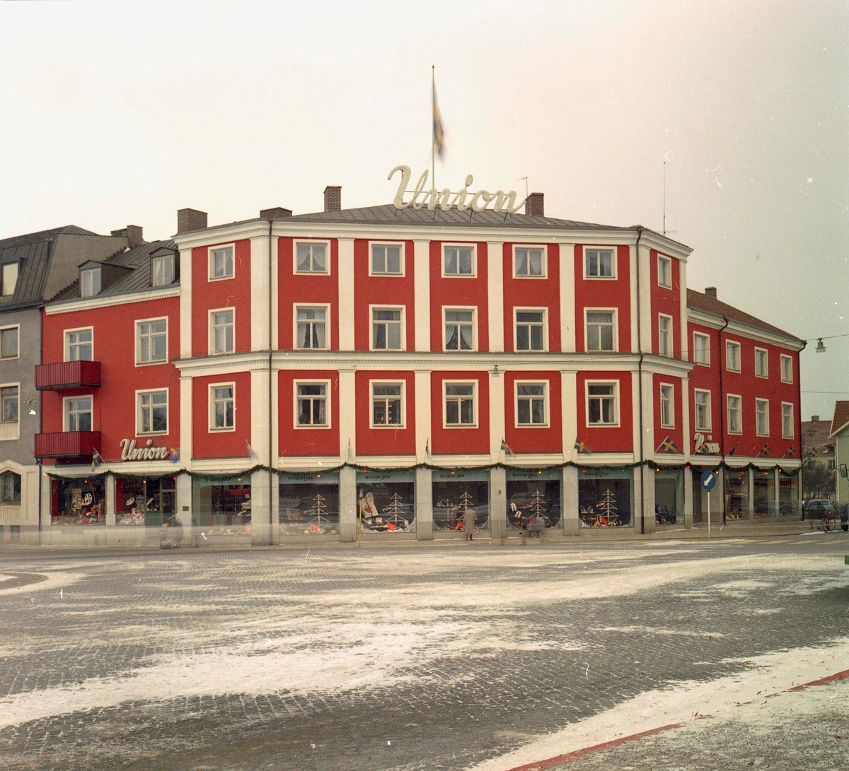 Bild över Drottninggatan i Huskvarna 7 december år 1959. Konsum Union i den röda byggnaden fyller 60 år.