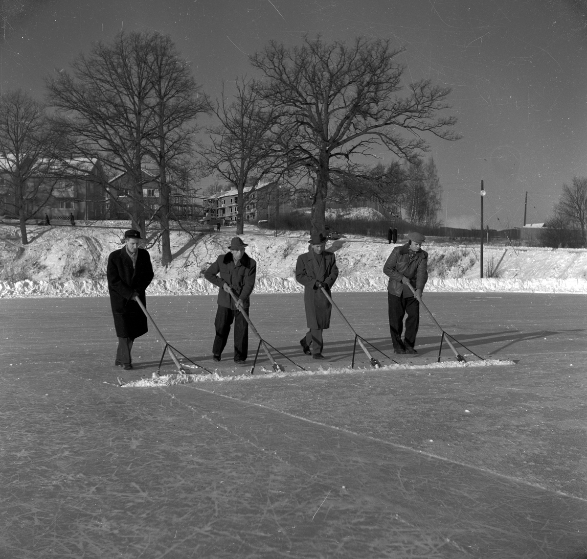 På "Zinkens damm" i Huskvarna skrapar några män bort snön från isen, bland annat Kalle Wahlgren (2).