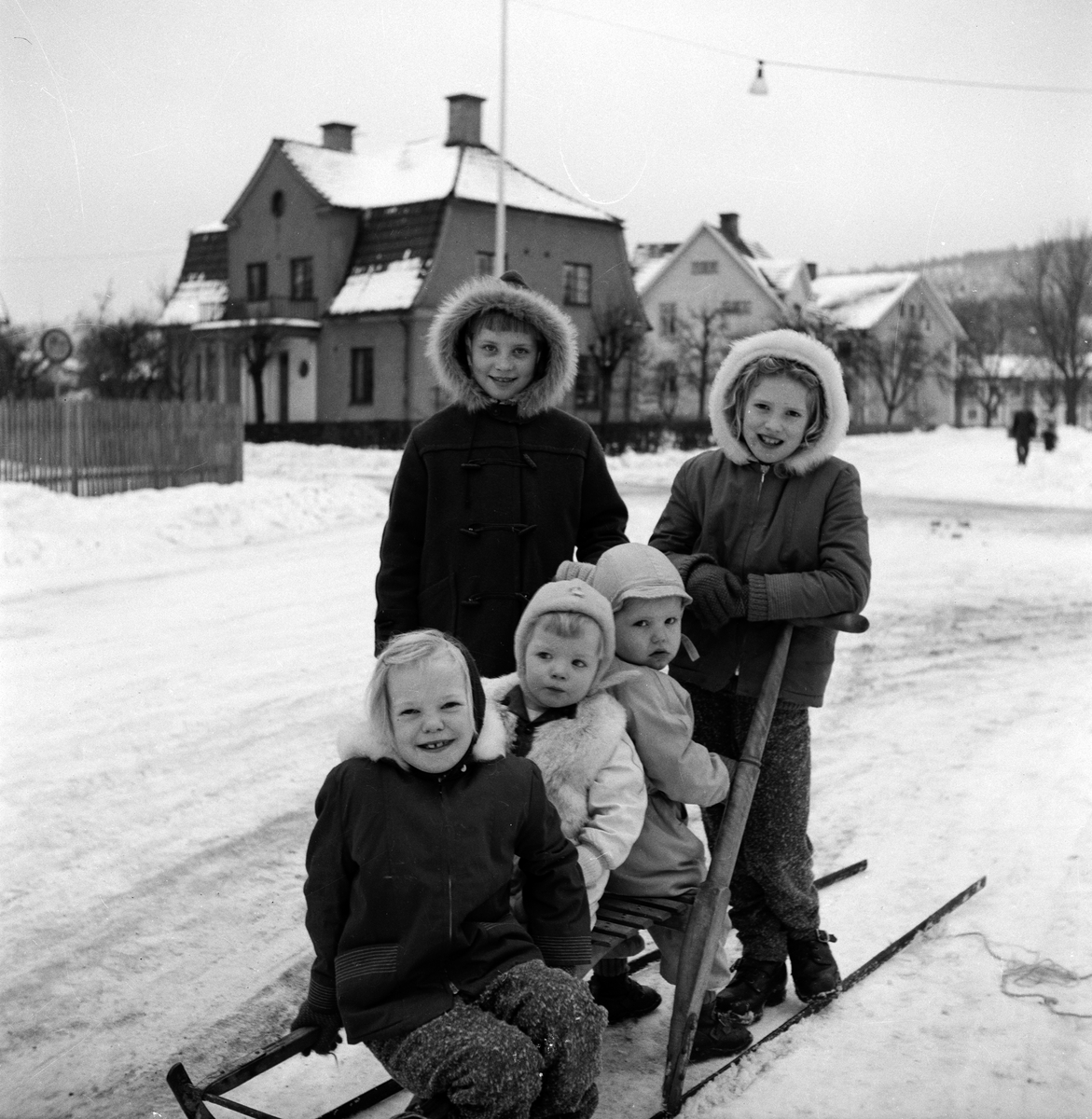 Vid korsningen Odengatan - Vättergatan i Huskvarna åker fem flickor spark. Stående från vänster: Nelson (1), Gunilla Tengman (2). Sittande: Tengman (3).