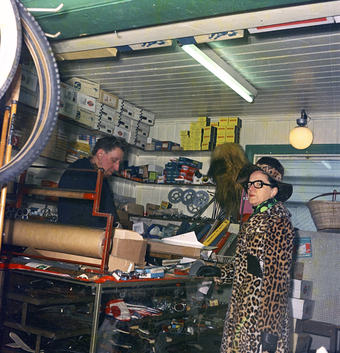 En pälsklädd dam står i cykelaffären hos W. Gustavsson "Cykel-Wille" (Eft. G. Karlsson) i Huskvarna.
