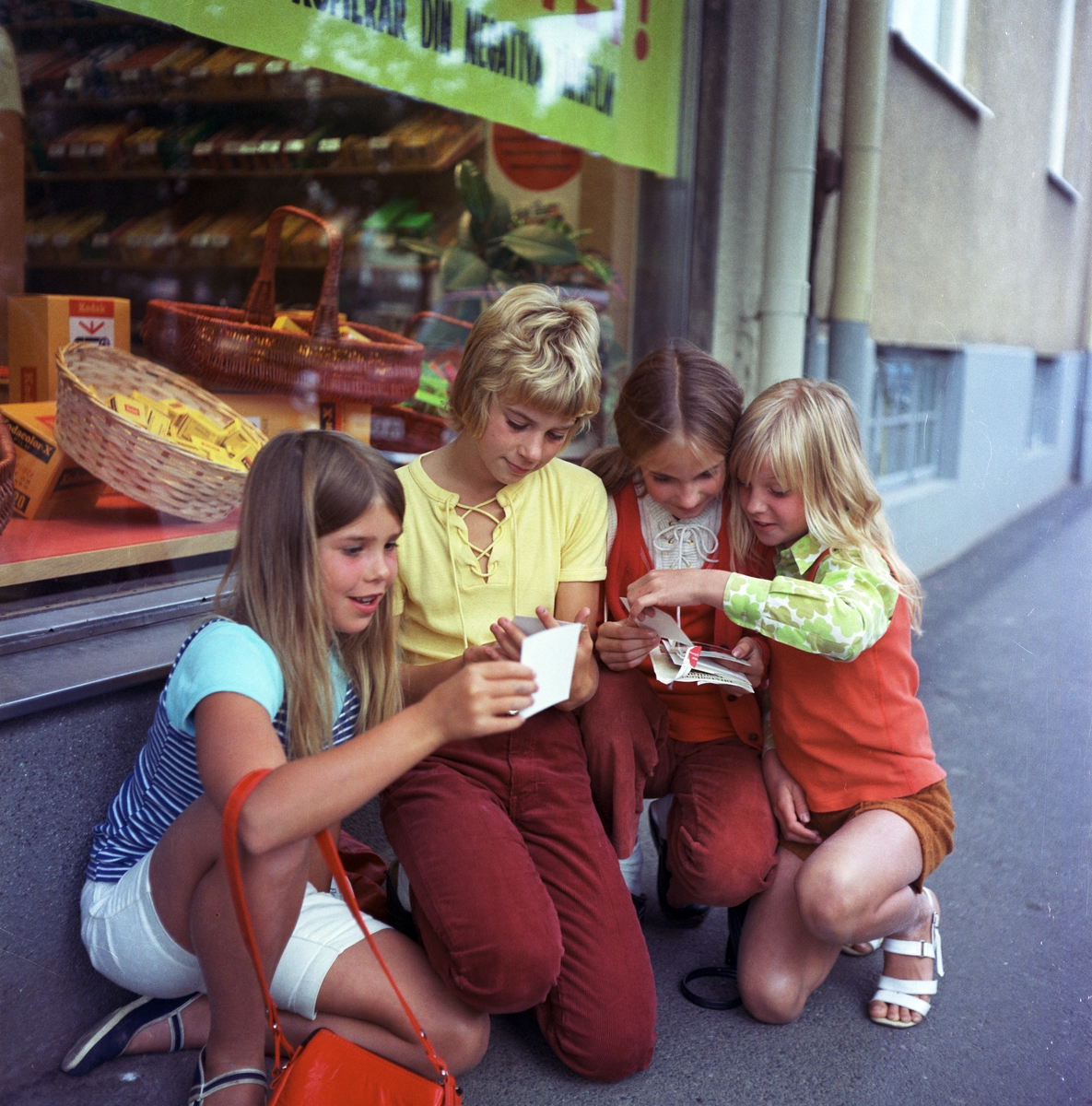 Utanför en fotoaffär i Huskvarna sitter fyra flickor och tittar på de nyss framkallade bilderna.