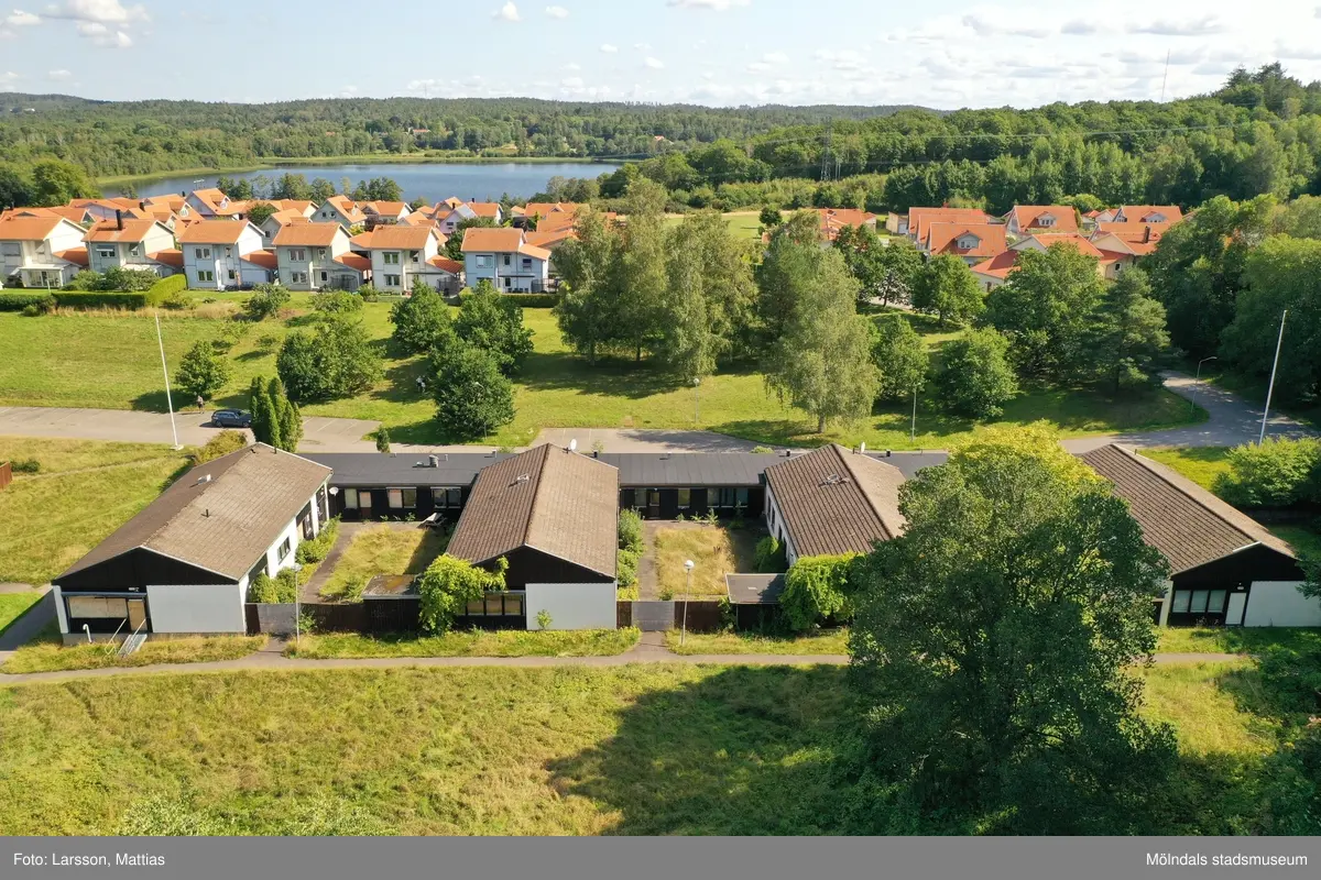 Flygfotografi som visar bebyggelse i Stretered, Kållered, i Mölndals kommun. Vy mot nordost. Närmast ses kamhuset Backegården, Stretered 1:106, med gatuadress Ängbackevägen 13-19. I bakgrunden ses nyare bostadsbebyggelse vid samma gata samt Tulebosjön. Byggnadsdokumentation inför rivning. Fotografi taget av Mattias Larsson, Borohus AB, den 23 augusti 2021.